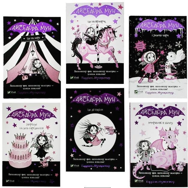 Книги Гаррієт Мункастер про Айседору захоплюючі, веселі та добрі. вони допомагають кожній дитині повірити у собі. Айєдора Мун – це дівчинка – феномен. Вона напівфея, напів вампірка. Ця маленька дівчинка не просто героїня книги, а справжній символ того, що кожен із нас може бути неповторним та унікальним. На честь Айседорі Мун названо мороженим в одному лондонському кафе. Наприкінці книг маленьких читачів чекають різні активності: веселі ігри, тести, а також рецепти льодяників та печива. У комплект входить 6 книг: Айседора Мун йде до школи Айседора Мун їде на море Айседора Мун запрошує на день народження. Айседора Мун потрапляє в халепу Айседора Мун йде на ярмарку Айседора Мун та зимові чари