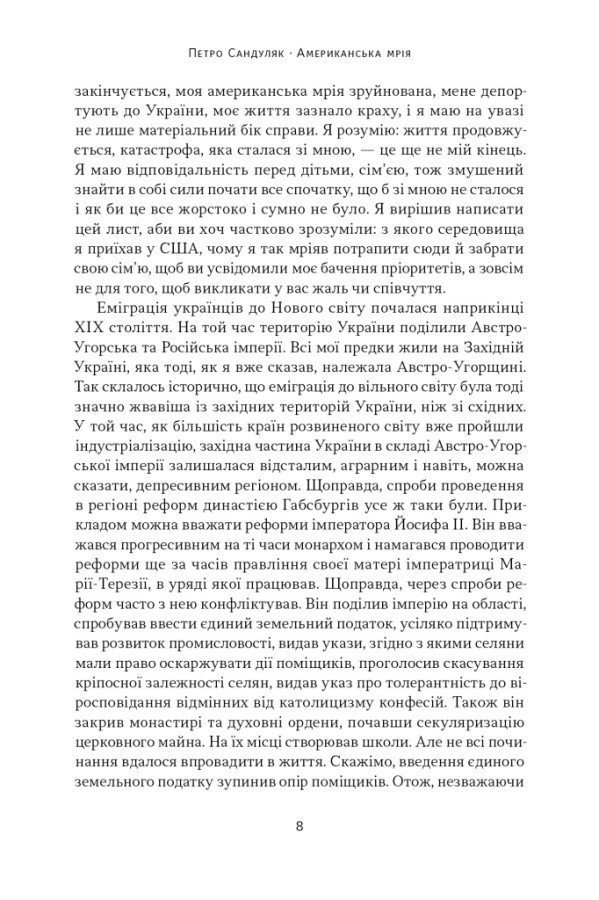 Петро Сандуляк прибув до США без знання мови та зв’язків, починаючи свій шлях звичайним озеленювачем. Проте вже за півтора року наполегливої праці він заснував власну справу. Згодом його бізнес перетворився на успішну компанію з мільйонним обігом та штатом у двісті працівників. Але ця історія далека від хрестоматійної казки з ідеальним фіналом. Благословенна Америка дала героєві шанс на зліт, а потім жорстоко повернула його на грішну землю. Автор відверто розповідає про свої победи та поразки, що зробили його сильнішим. Це розповідь про справжню ціну американської мрії та здатність підніматися після найважчих ударів долі.