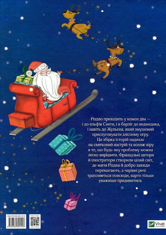 Різдво приходити в кожен дім — і до ельфів Санті, і в барліг до ведмедика, і навіть до Жульєна, який змушений прислуговувати злісному огру. Ця збірка історій надихає на святковий настрій та вселяє віру в те, що будь-яку проблему можна легко вирішити. Французькі автори та ілюстратори створили цілий світ, де магія Різдва і добро завжди перемагають, а чарівні речі трапляються всюди, варто лише уважніше придивитися.
