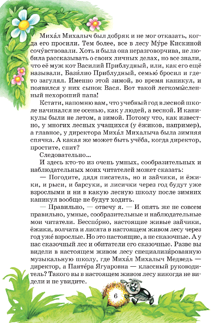 Легка, життєрадісна, сповнена доброго гумору книга продовжує розповідь про веселі, цікаві пригоди зайчика, їжачка та їх однокласників, учнів спеціалізованої музичної лісової школи з ведмежою мовою викладання. Для дітей молодшого та середнього шкільного віку.