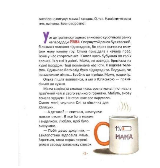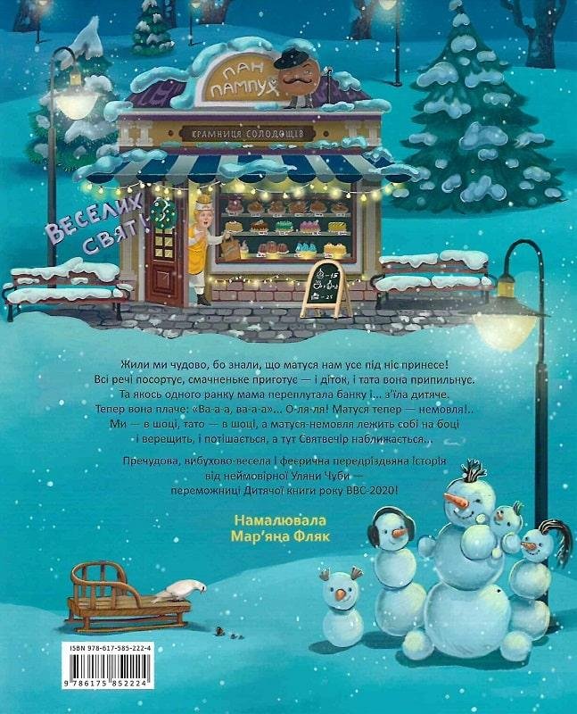 Жили ми чудово, бо знали, що матуся нам все під ніс принесе! Усі речі посортує, смачненьке приготує — і діток, і тата вона припильнує. Та одного ранку мама переплутала банку і… з’їла дитяче. Тепер вона плаче: “Ва-а-а, ва-а-а”… О-ля-ля! Матуся тепер — немовля!.. Ми — в шоці, тато — в шоці, а матуся-немовля лежить собі на боці і верещить, і потішається, а тут Святвечір наближається… Чудова, вибухово-весела і феєрична передріздвяна історія від неймовірної Уляни Дотепні ілюстрації на будь-який веселий смак удохновлено малювала для вас Мар’яна Фляк.