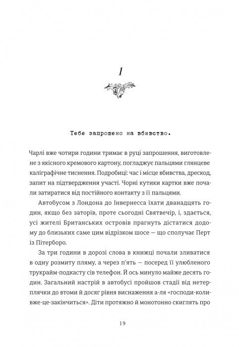Вісім друзів, один старий маєток і незакритий гештальт із минулого. Спільнота, що колись гралася у детективи, знову у зборі. Усі отримали ролі: Лорд, Лікар, Міс… Атмосфера свята, сніг, розкіш. І труп, що ідеально вписується у декорації. Повішена на груші жінка — це дуже театрально навіть для них. Чарлі, яка ніколи не була «своєю» у цій компанії, розуміє: вбивця не зовні, він серед гостей. Стара пісня «Дванадцять днів Різдва» перетворюється на зворотний відлік. Чи зможе аутсайдерка переграти тих, хто звик керувати життям, і з’ясувати, куди насправді зник їхній друг багато років тому?