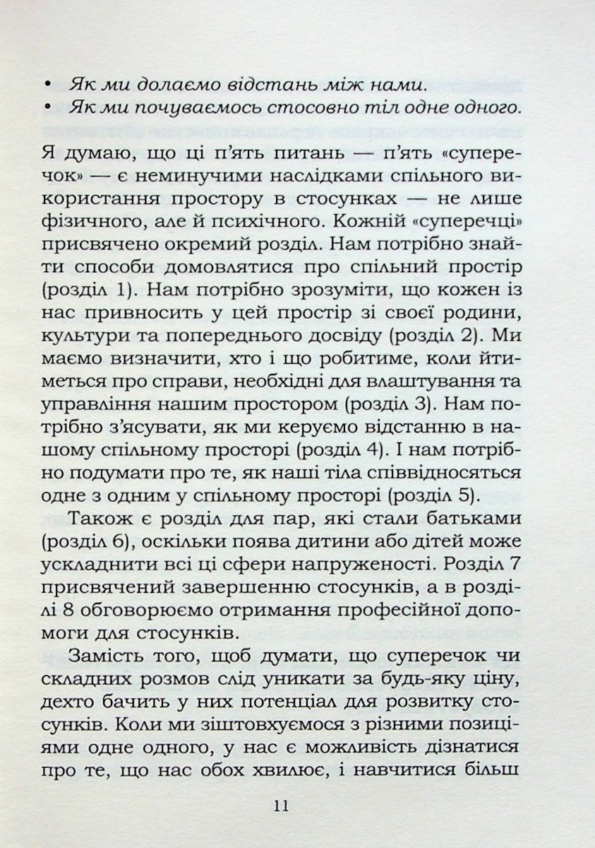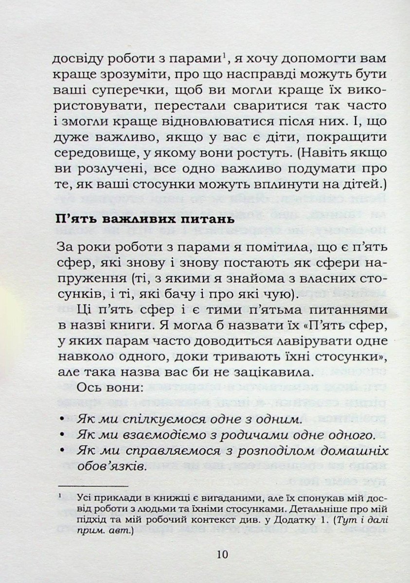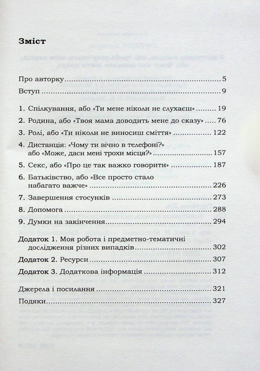 “Перша допомога” для пар. Чому стосунки руйнуються і як їх врятувати. Джоанна Гаррісон – досвідчений сімейний психотерапевт, колишній адвокат з розлучень, дружина та мати. Весь цей життєвий досвід наштовхнув її на думку, що стосунки – це праця, і подеколи ми всі потребуємо допомоги. Ця книжка призвана стати підтримкою у складні періоди сімейної життя. Якщо вам здається, що ви постійно зварюєтеся зі своїм партнером, вам не здається… Психолог Джоанна Гаррісон вважає, що існує 5 основних питань, які необхідно розв’язати, щоб збудувати щасливі та гармонійні взаємини: • Спілкування, або «Ти мене ніколи не слухаєш» • Батьківщина, або сміття» • Приходь і відходь, або «Чому ти вічно в телефоні?» • Секс, або «Про це так важко говорити» Тут ви знайдете не лише поради, а й практичні інструменти, які можете використовувати для вирішення конфліктів. Ця книжка стане вашою надійною опорою у переосмисленні взаємин.