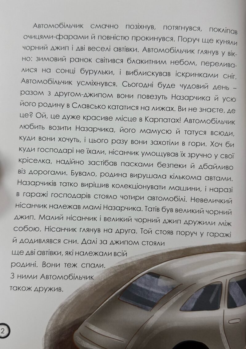 Маленький автомобіль прокидається утром сповнений радості — попереду його перша велика подорож у горі. Він мріє повезти Назарчика та його батьківщину до Карпат, де всі разом кататимуться на санчатах та лижах та насолоджуватимуться зимовою казкою. Здавалося б, ніщо не зможе зіпсувати цей день. Та раптово на місто приходить опасность: замість казкової мандрівки на горизонті з’являються ворожі танки. Вміти плани руйнуються, і автомобіль змушений взяти на собі нову, значно важливішу місію — урятувати своїх пасажирів і вберегти їх від загрози. Йому доведеться здолати довгий тривожний шлях, перш ніж він дістанеться до безпечної території, де майорять жовто-блакитні прапори та де українські захисники стоятимуть на варті людських життів. Там батьківщина знаходитиме прихисток, підтримку і надію. Ця химерна історія — про відвагу, турботу, силу любові та ті, що справжні герої іноді мають чотири колеса і велике добре серце. Книга створена для спільного родинного читання та м’яко пояснює дітям, що навіть у складні години є місце світлу, доброті та безпеці.