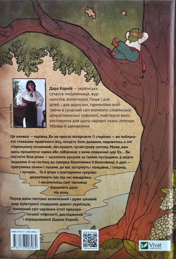 Дарунка Корній – сучасна українська письменниця, журналістка, волонтерка. Пише і для дітей, і для дорослих, гармонійно вплітаючи у сучасний світ елементи слов’янської дохристиянської міфології, майстерно використовуючи для цього народні казки, легенди, обряди та замовляння. Ця книжка – чарівна. Ви не просто погортаєте її сторінки – ви поблукаєте стібками правичного лісу, почуєте його дихання, здивуєтеся в очі старенькому лісовикові, послухаєте чугайстрову сопілку. Може, вам щось прошепоче мавка чи побалакає з вами поважний цар Ох… Ви постоїте біля річки – заходьте русалок за їхніми пустищами, а звідти недалеко й на вітальню до суворих болотників та болотяниці. А далі – прогулянка полем і луками, де вас зустрінуть і половик, і спориш, і щучник… Та й вітри з повітрулями будуть супроводжувати вас під час мандрівки. І насамкінець свої таємниці відкриють парфуми пір року. Перед вами постає величезний і дуже цікавий куля культурної спадщини давніх українців, химерний світ чарівних істот праукраїнської міфології, досліджень та опрацьований Дарою Корній.