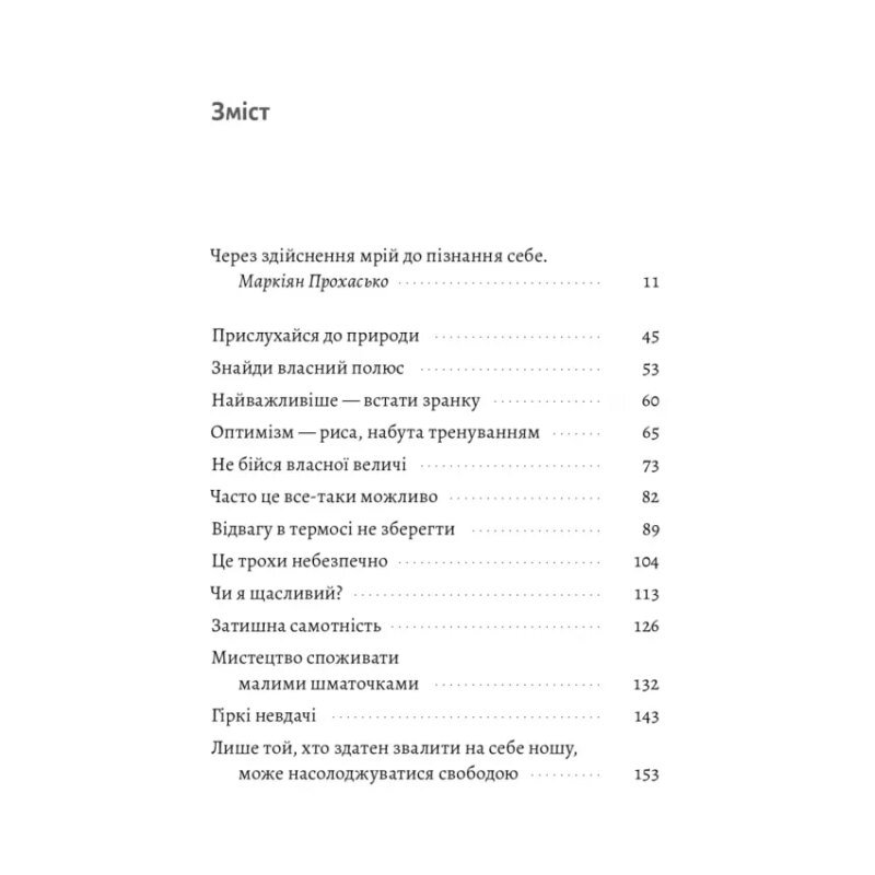 Є те чому нас точно не навчати у школі – стійкості перед невдачами, розпалювання жаги до нових відкриттів та пригод, безстрашності перед випробуваннями та впертості йти своїм шляхом. Ерлінґ Каґґе, полярний дослідник, запевняє, що вчитись ніколи не пізно і завжди можна знайти вдалий момент, щоб змінити життя на краще. Книгамандрівка Арктикою та Антарктикою стане незамінним путівником у пошуках напрямку для власних мрій та бажань. Від банального раннього підйому до підкорення Євересту, від прийняття дрібних невдач до перемоги над арктичним штормом – іноді неможливо впливати на умови, але ми можемо впливати на себе.