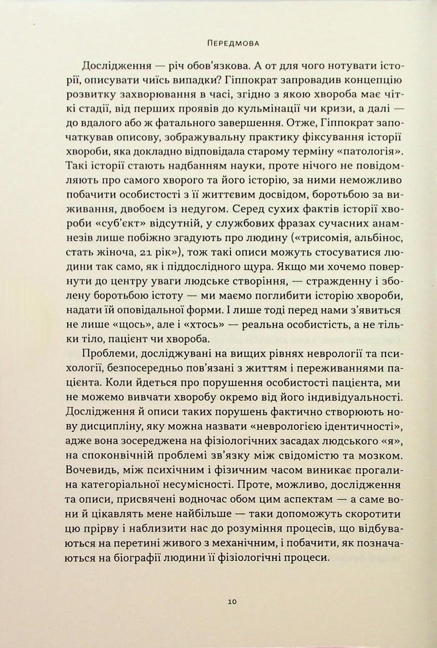 Болезнь може забрати пам’ять, але не може забрати душу. Олівер Сакс — не просто невролог, він — провідник з екзистенційного лабіринту. Його пацієнти — це люди, які втратили звичний зв’язок із реальністю. Хтось із них застряг у минулому, хтось чує музыку, якої не існує, а хтось став генієм усупереч діагнозам. Автор бере їх (і читача) за руку, щоб показати: навіть за найтяжчими порушеннями психіки ховається жива, унікальна особистість. Ця книга вчитиме емпатії та розуміння того, що бути людиною — це дещо більше, ніж просто мати набір стандартних фізіологічних функцій. Глибокі, зворушливі, а часом і кумедні історії про боротьбу за власне «Я».