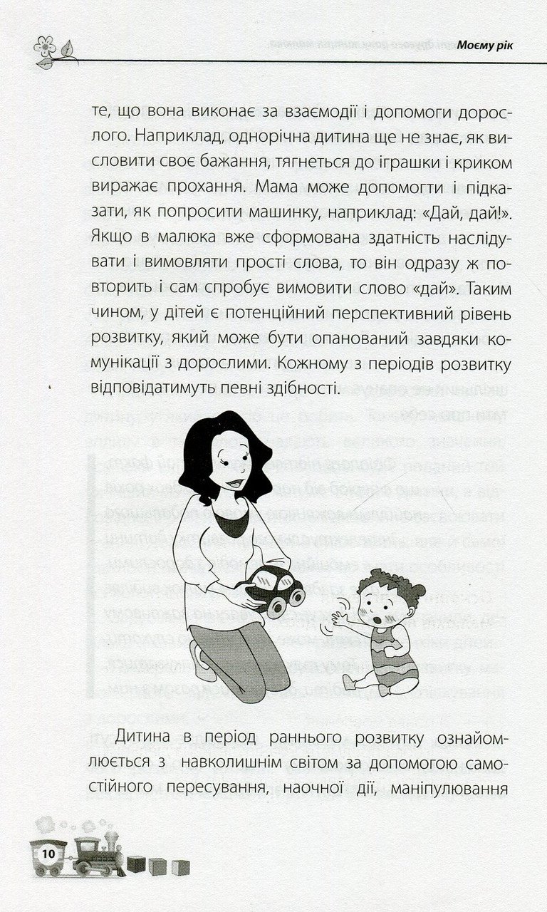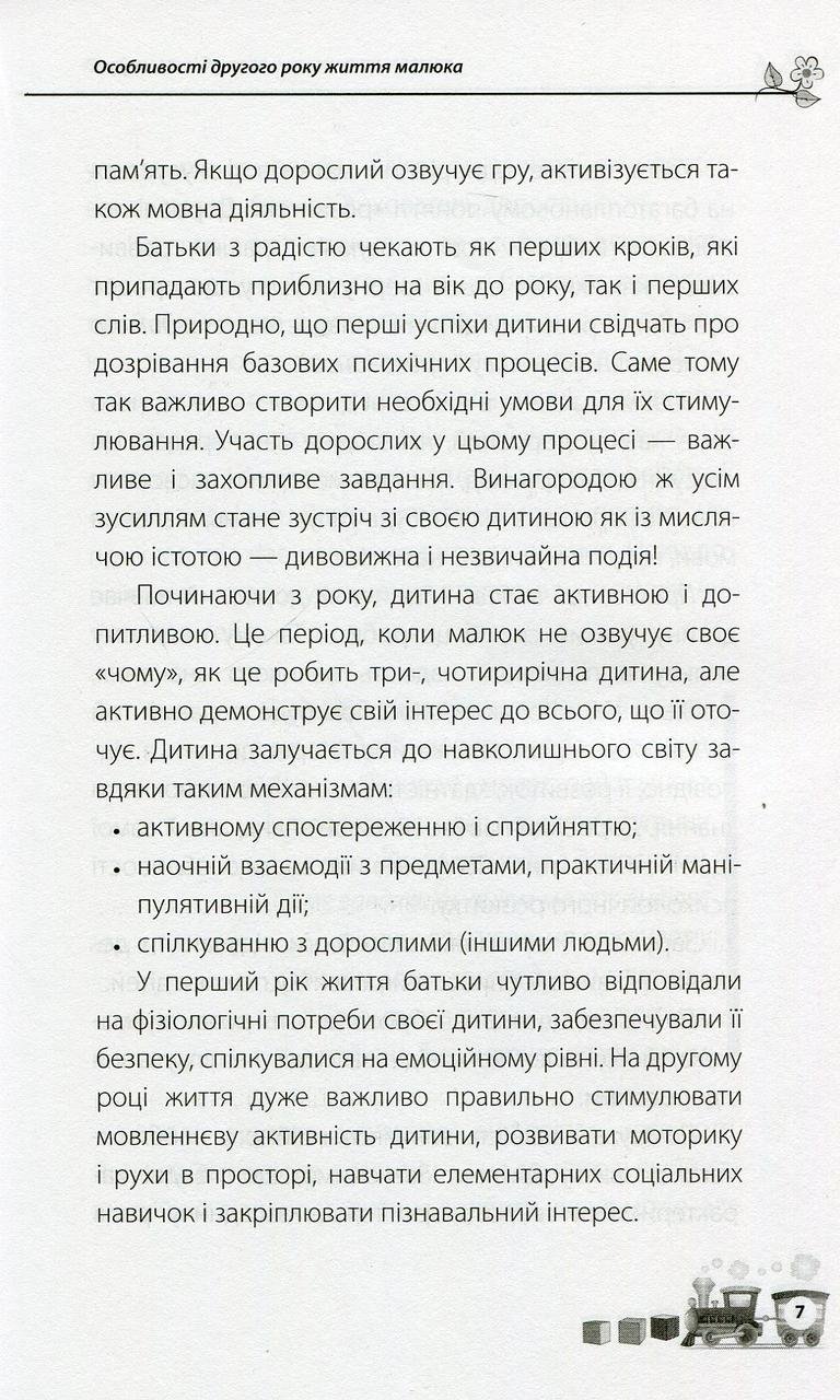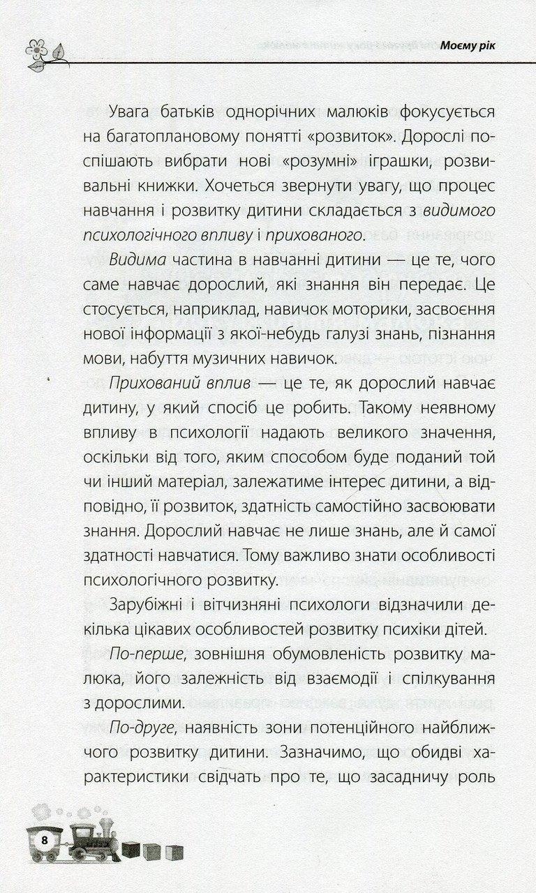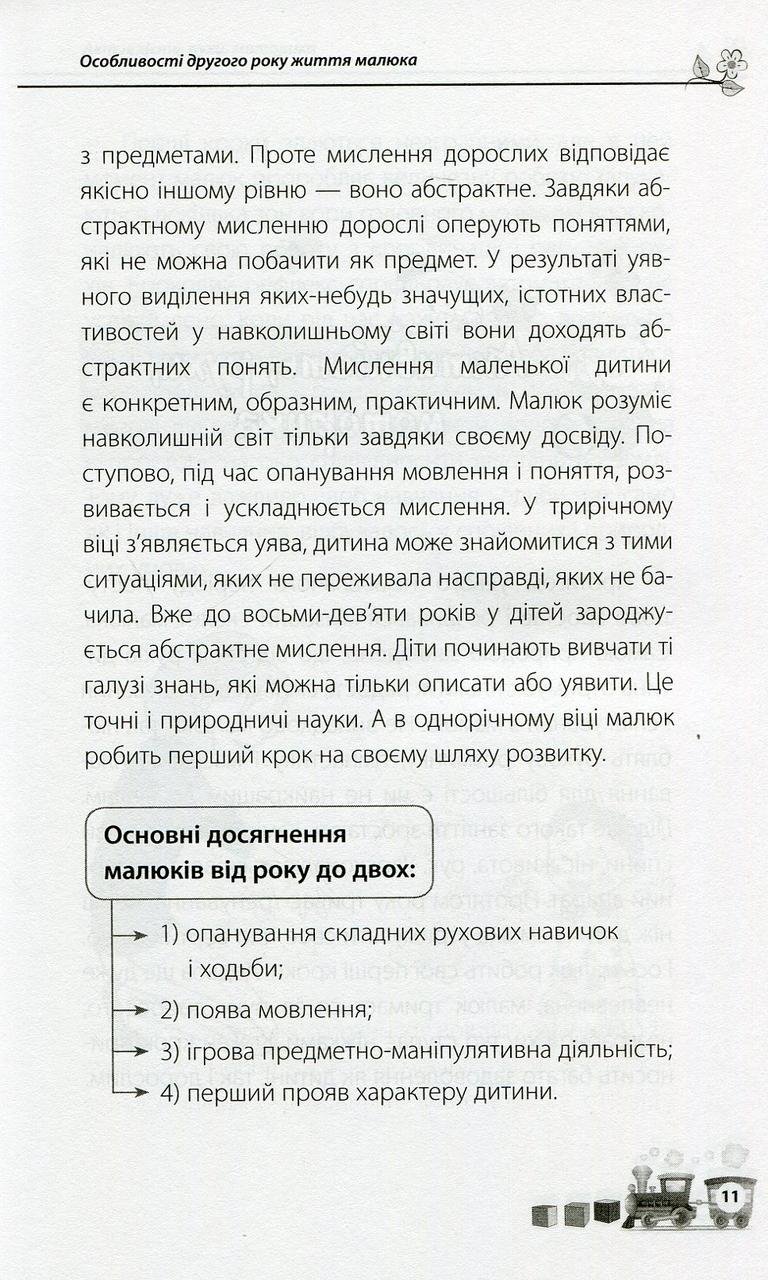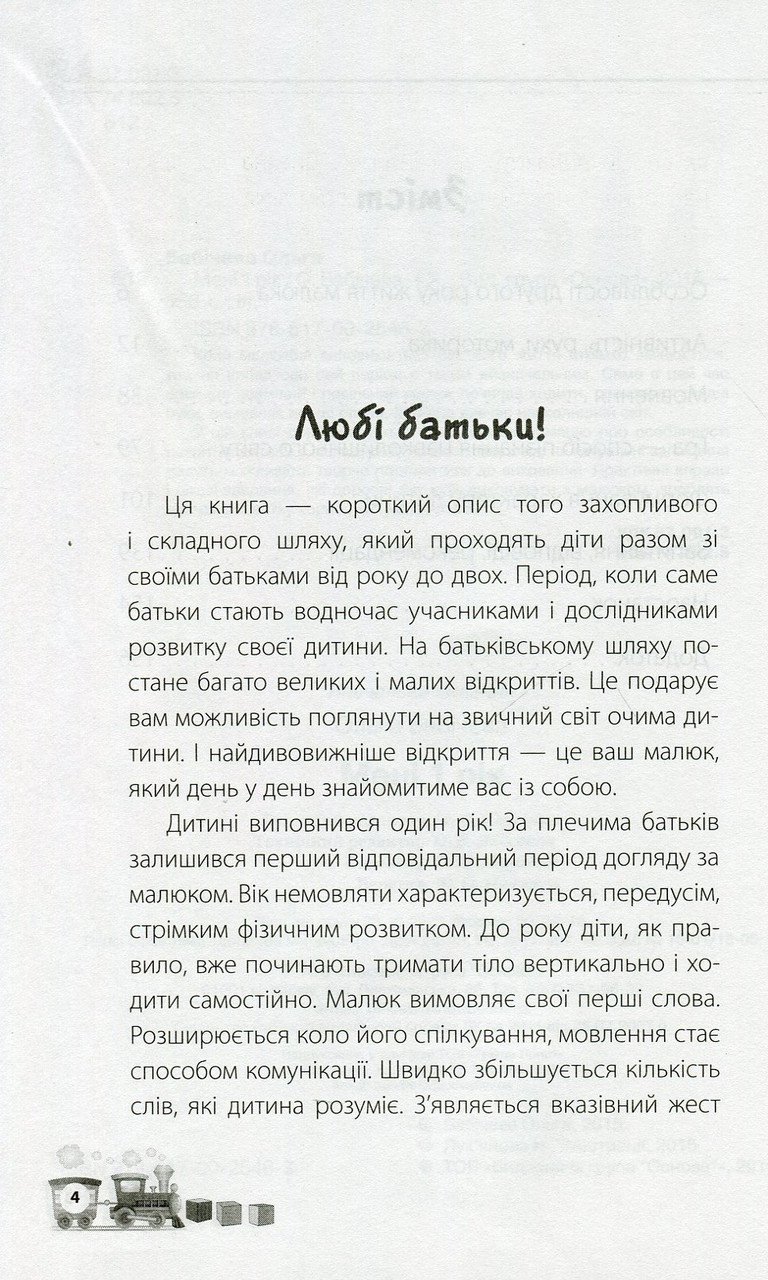 Коли малюкові виповнюється рік, його життя швидко змінюється, тож не випадково цей період є таким визначальним. Саме в цей час доки ще невмілий і повільний малюк швидко освоює ходьбу, складні рухи, вимовляє перші слова, активно вивчає навколишній світ. У цій книжці дбайливі батьки знайдуть інформацію про особливості розвитку дитини у віку від року до двох. Відповіді на актуальні запитання дадуть змогу творчо поставитись до виховання. Практичні вправи та цікаві завдання, які дорослі зможуть виконувати з малюком, роблять цей рік розвитку корисним і незабутнім.