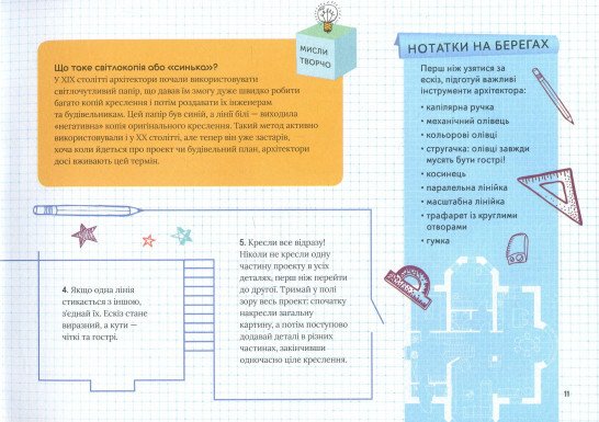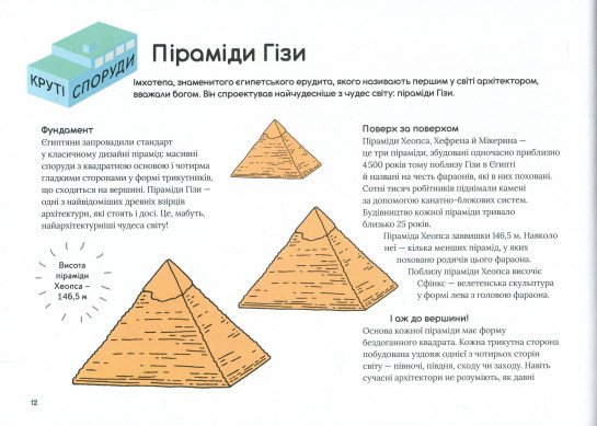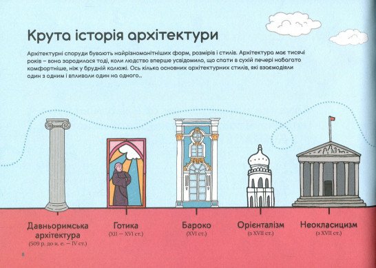 Ця книжка — чарівний ключ до воріт дивовижного замку під назвою «Архітектура». Вона розповість про неймовірні архітектурні подвиги, геніальні винаходи та дивовижні досягнення. Познайомити читачів та читачок із найвідомішими будівлями світу — від пірамід Гізі та собору Саґрада Фамілія до фантастичних будов Захи Хадід, хмародерів у Дубаї та лондонського “Уламка”. Книга розповість про основні стилі архітектури, від найдавніших до найсучасніших, та про знаменитих архітекторів: Брунеллескі, Ллойда-Райта, Тадао Ондо та інших. А тих, хто мріє у майбутньому займатися цією справою — навчити креслити як справжні архітектори.