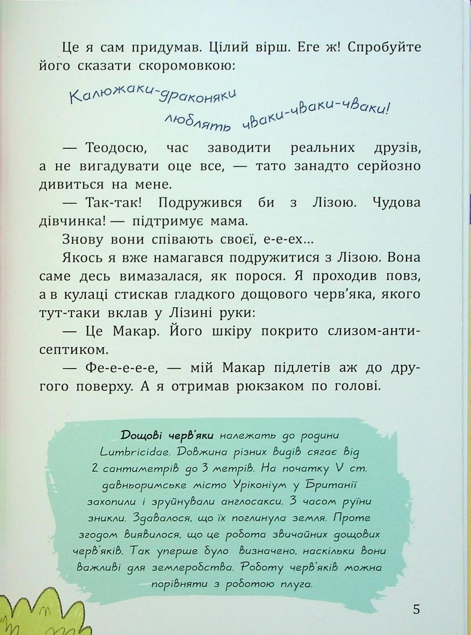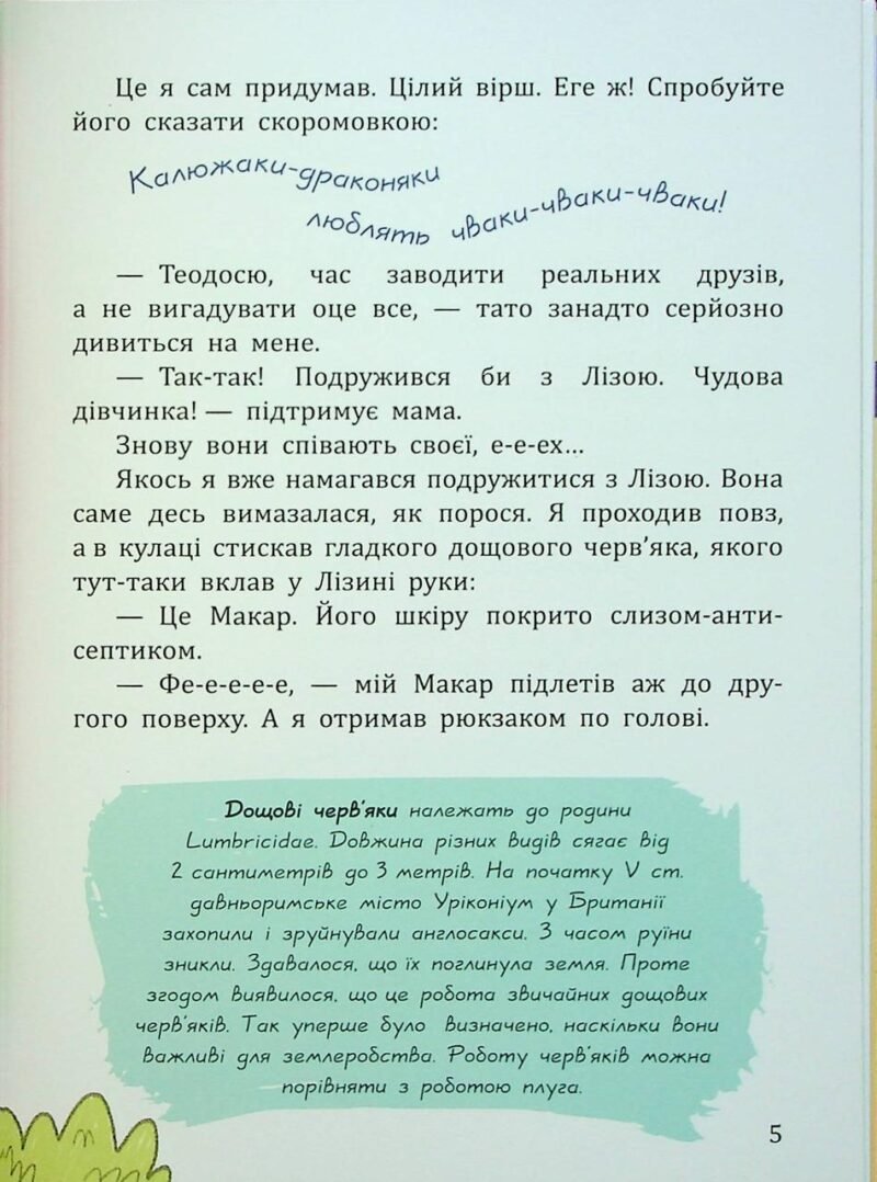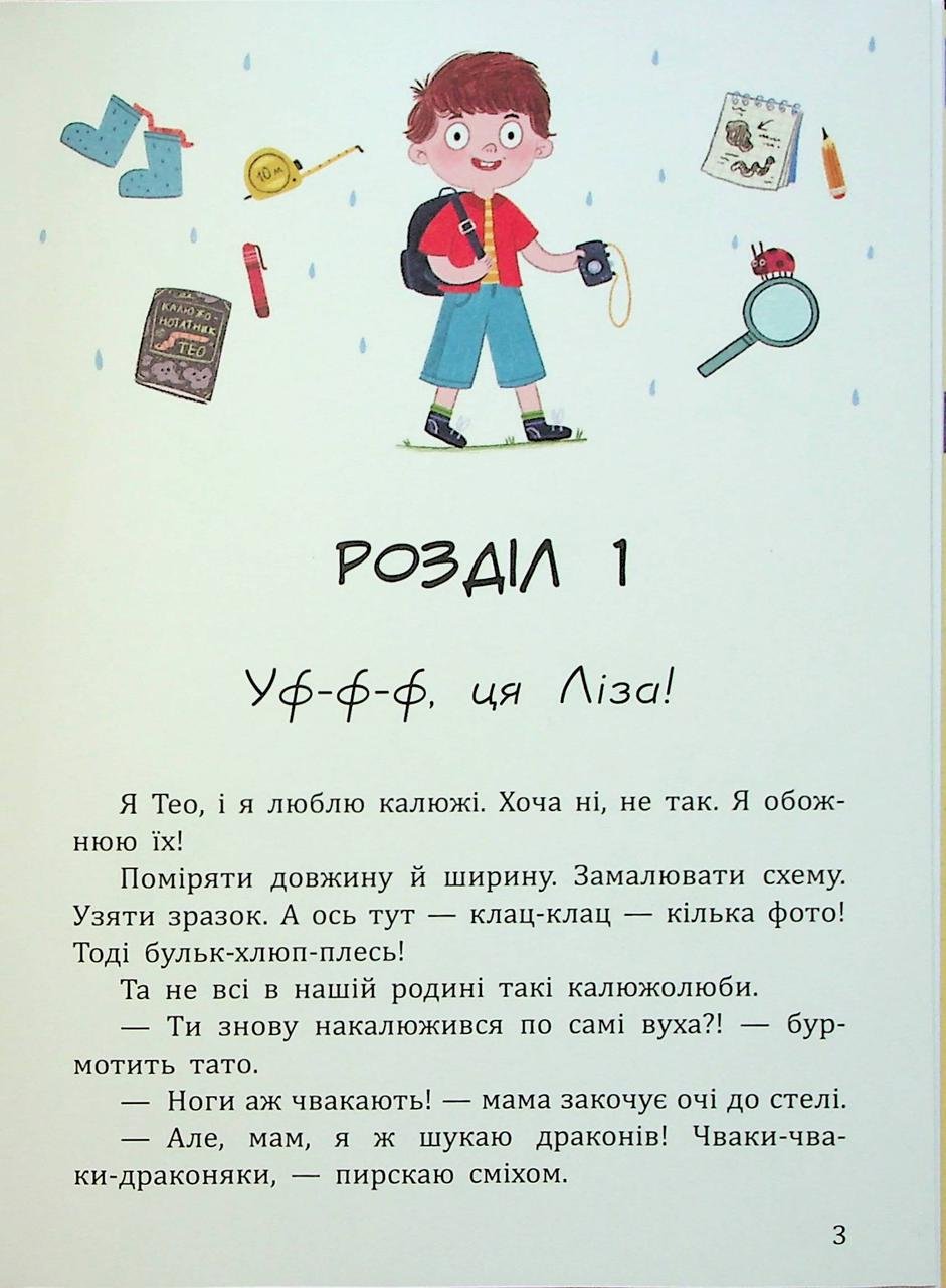 Для більшості дорослих калюжа — це лише прикра перешкода на дорозі, яку треба обійти, щоб не забруднити взуття. Але для хлопчика Тео шкірна дзеркальна гладь на асфальті — це портал у неймовірній всесвіті. Поки оточуючі бачать лише грязну воду, Тео бачить цілі екосистеми, де у кожній крапліні вирує життя, а у глибині, можливо, причаївся справжній водний дракон. На щастя, Тео не одинокий у своїх пошуках. Його бабуся — справжня «калюжна професорка» — знає, що наука починається не з нудних підручників, а з цікавості та гумових чобіт. Саме вона відкриває онукові секрети мікросвіту, вчитиме користуватися уявою як мікроскопом і доводити: щоб стати великим дослідником, іноді треба просто не боятися заляпатися. «Дракон із калюж» — це не просто мистецька оповідь, а повноцінний інтерактивний путівник для юних натуралістів. Книжка вдало поєднує магію казки з реальними науковими фактами. Завдяки завданням, розробленим фахівцями, звичайна прогулянка після дощу перетворюється на серйозну експедицію. А набір яскравих наліпок робить фіксацію результатів «дослідів» настільки захоплюючою, що дитину буде важко затягнути додому, доки не буде перевірена остання калюжа у дворі.