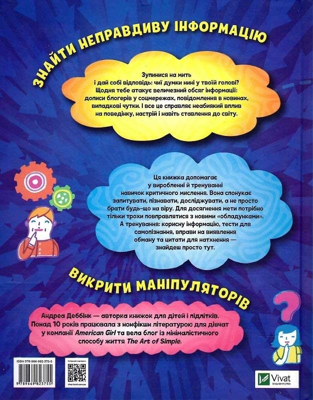 Остань на мить і дай собі відповідь: чиї думки нині у твоєї голові? Щодня тобі атакує величезний обсяг інформації: дописи блогерів у соцмережах, повідомлення у новинах, випадкові чутки. І все це справляє неабияке вплив на поведінку, настрій і навіть ставлення до світу. Ця книжка допомагає у виробленні й тренуванні навичок критичного мислення. Вона спонукає запитувати, пізнавати, досліджувати, а не просто брати будь-що на віру. Для досягнення мети потрібно лише трохи повправлятися з новими «доладками». А тренування: корисну інформацію, випробування для самопізнання, вправи на виявлення обману та цитати для натхнення — знайдеш просто тут.