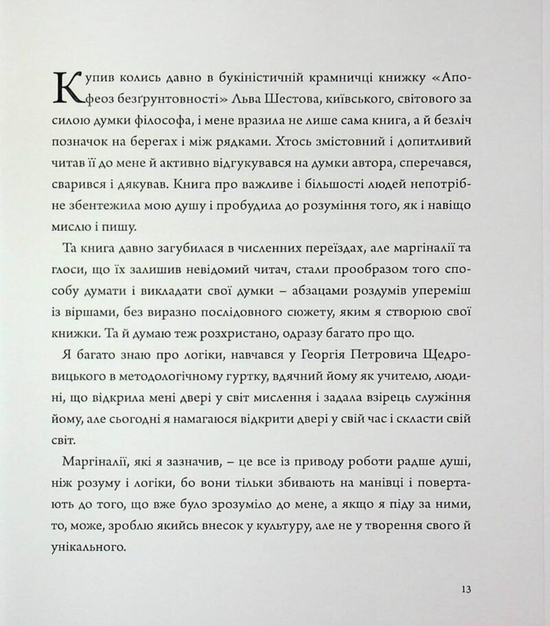 «Глоси і маргіналії» Володимира Африкановича Нікітіна — це не просто добірка текстів, а інтимний щоденник душі, яка мислити і помилується, молитися і сумнівається, тужити і радіє разом зі світом. «Я не шукаю істини. Я вірю в любов і доброту», — зізнається автор, і ця фраза стає ключем до всієї книги. У центрі — роздуми про життя, тишу, війну, преображення, любов, Бога та людську присутність у світі, що безупинно змінюється. Нікітін говорити із читачем мовою глос — коротких нотаток, спостережень, реплік, що перегукуються зі рядками його улюблених мислителів і поетів: від Сковороди й Твардовського до Борхеса та Гуєррі. Друга частина книги — маргіналії: думки, що народилися на берегах прочитаних текстів і проросли власним досвідом, болю та прозріннями. Це видання — для тих, хто хоче не лише читати, а й слухати внутрішній голос, повертатися до себе та знаходити опору у любові та доброті.