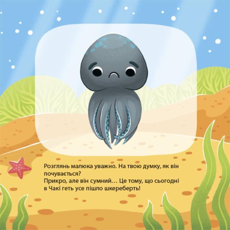 Восьминіжка Чакі переживає різні емоції. Він радіє, сумує, злиться, дивується, боїться. Знайомитись зі своїми почуттями і намагається керувати ними. Разом із Чакі маленькі читачі також дізнаватимуться про різні емоції та вчитиметься приймати їх і давати собі раду. Сьогодні Чакі сумує… Адже він так хотів прокинутися і побачити велике оранжеве сонечко, проте ранок видався похмурим, і настрій восьминіжки зіпсувався. Хто чи що зможе його покращити? Авторка книжок — психологіня і дитяча письменниця Наталія Чуб. Шкірна книжка серії містить історію, присвячену певній емоції, та кілька цікавих запитань та завдань наприкінці.