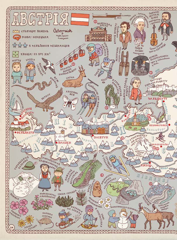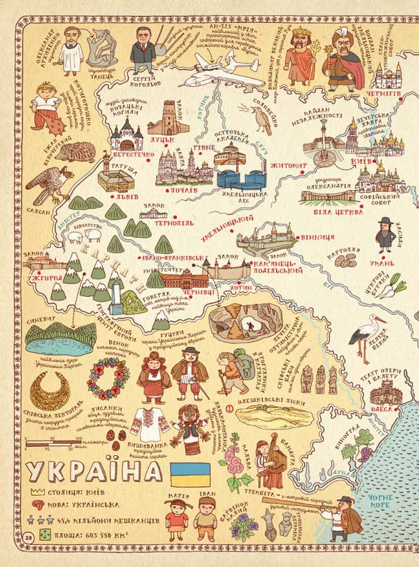 16 додаткових карт! Ця книга запрошує у захоплюючу навколосвітню подорож. Ви побачите могутні гейзери Ісландії, довгі каравані у пустелях Єгипту та величні міста майя у Мексиці. В Англії зіграєте у крикет, в Індії займетеся йогою, а в Китаї дізнаєтесь про теракотову армію. Австралія здивує вас качкодзьобом, Фінляндія – полярною ніччю, Мадагаскар – гігантським баобабом. Книга відкриє перед вами найцікавіші місця світу та Батьківщини. Понад 60 великих карт проведуть вас 6 континентами та 58 країнами. Безліч детальних зображень німів перенесуть вас у неймовірні куточки планети і заохочуть побачити ще більше. Вдалої подорожі!