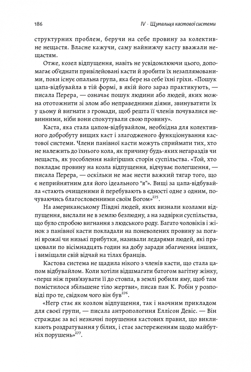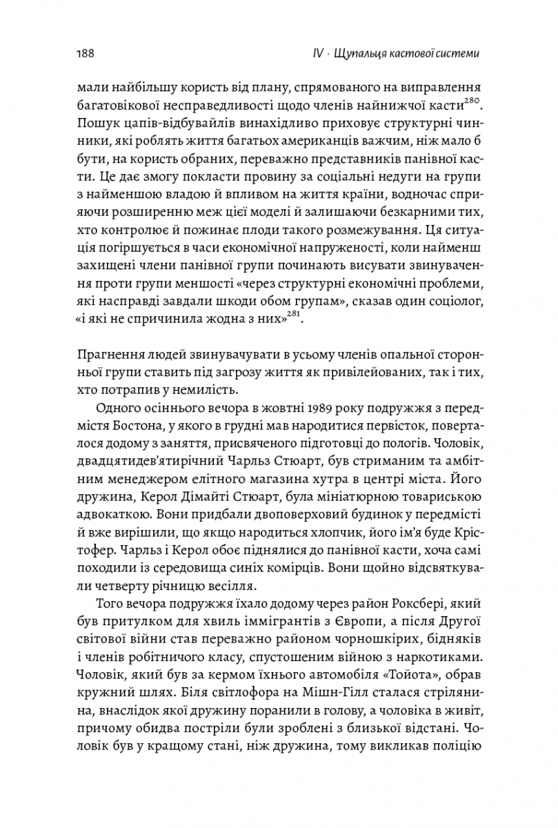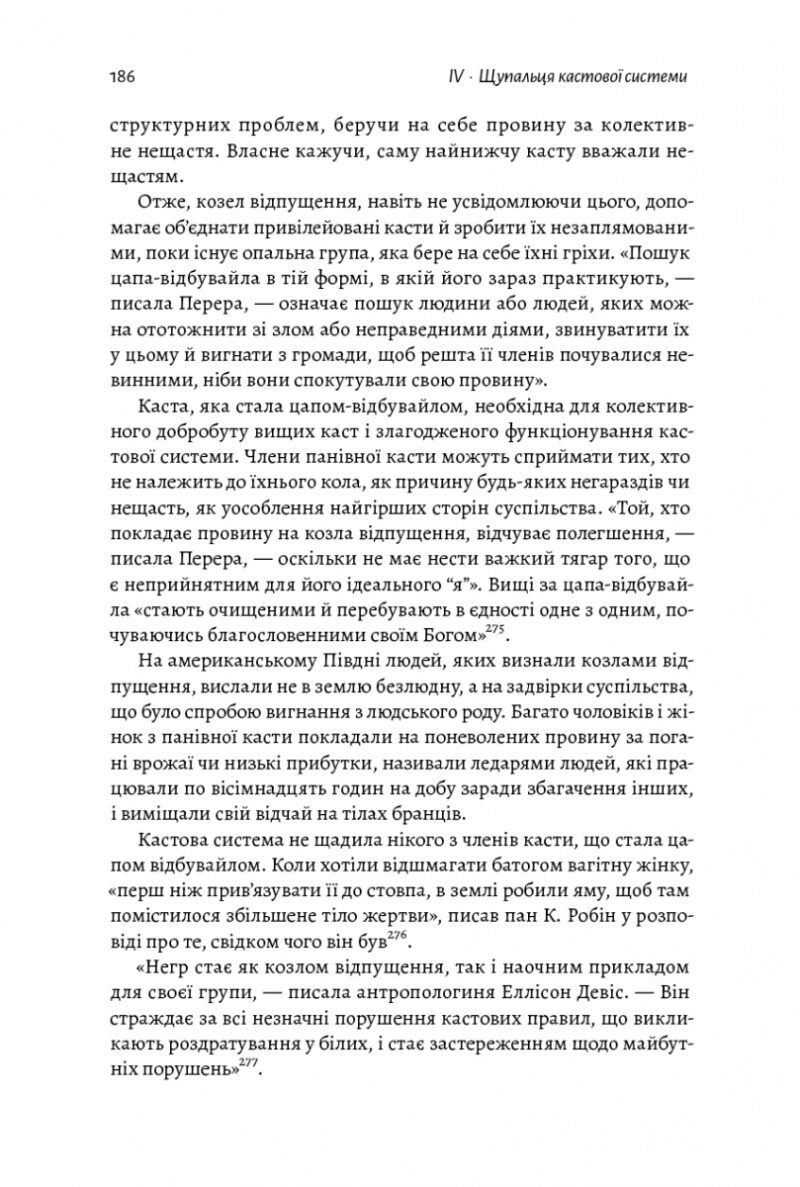 Наше суспільство побудоване на кастовій системі – кожен займає у ній своє місце. І хоча сьогодні у людини є право вибору та можливість стати тим, ким вона захоче, так було далеко не завжди. З давніх-давен люди були розділені на класи. Це тривало тисячоліттями. Ба більше, сьогодні у багатьох країнах чітко простежується штучне розмежування між бідними та багатими, могутніми та безвладними, а що вже й говорити про бідні країни? Крім раси, класів та інших факторів розділу суспільства в світі існує могутня і при цьому невидима кастова система, яка впливає не лише на поведінку та частку звичайних людей, а й на цілі нації. Та насправді надія на вихід із цієї ситуації є. У своїй книжці авторка пропонує власні шляхи розв’язання глобальної проблеми несправедливості та розмежування людей. Про автора: Ізабель Вілкерсон – американська журналістка і авторка бестселлеру «Теплота інших сонць: епічна історія американської міграції», яку визнали однією з найкращих книжок 2010 року. Лауреат Пулітцерівської премії за нарис.