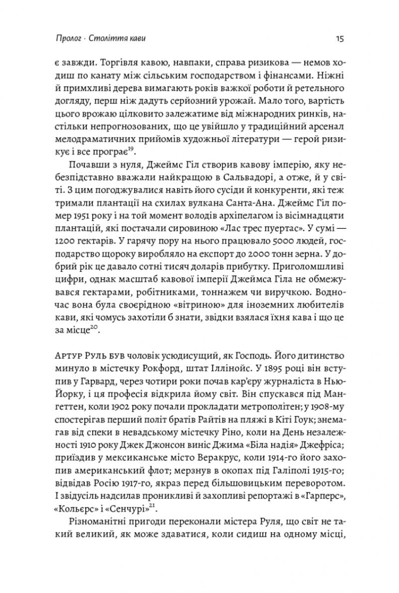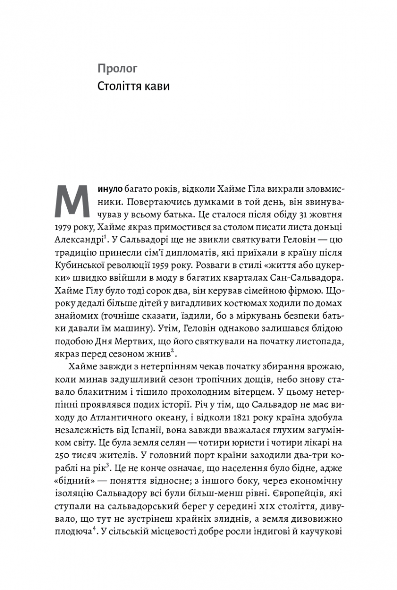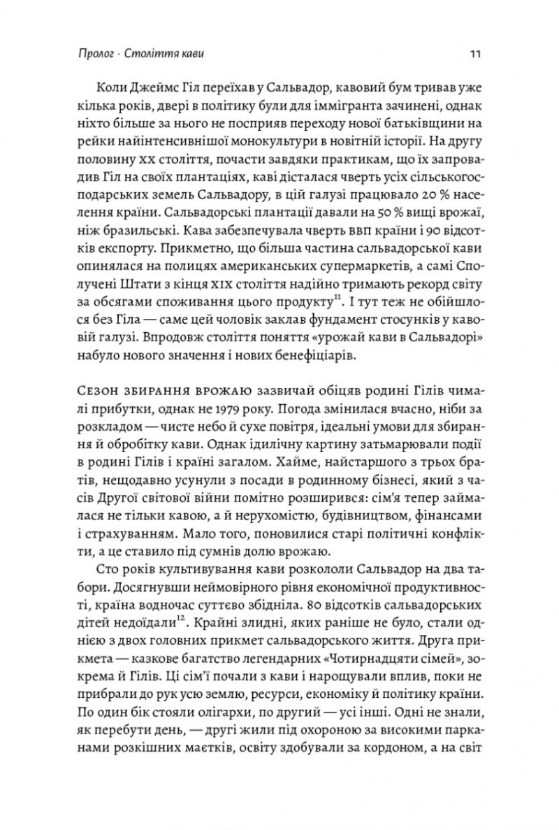 У XX столітті один англійський торговець Джеймс Гілл хитрістю і жорстокістю зміг побудувати цілу кавову імперію в Республіці Ель-Сальвадор. Як йому це вдалося? Цю фантастичну та маловідому історію розповідає автор цієї книжки, дослідник історії їжі, роботи та капіталізму, учасник Гарвардського наукового «Проекту з вивчення справедливості, добробуту та економіки» Огастін Седжвік. Він показує, як ми щодня п’ємо кофе і навіть не замислюємося, в яких умовах її могло бути зібрано та змелено. На плантаціях Джеймса Гілла панували нелюдські умови — кава стала майже символом капіталізму, тож людям, які знаходилися у підпорядкуванні власника плантації, доводилося працювати ще більше і потужніше. Ця історія фактично пояснить читачам макроекономічні, соціальні та політичні процеси на цілком звичному та наочному прикладі — процесі вирощування кавових зерен.