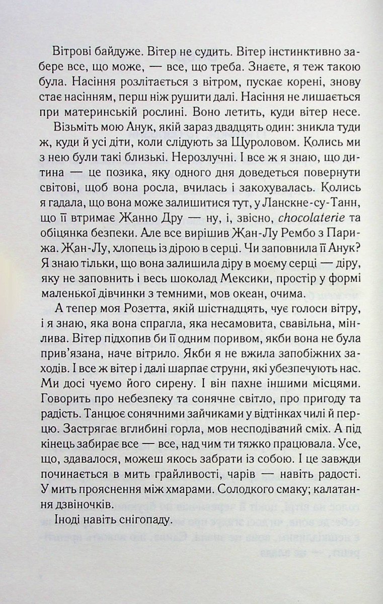 Віана Роше живе у Ланскне-су-Танн-місці, яке колись не приймало її, проте зараз стало домом. Тут вона виховує особливу дитину Розетту, керує власним магазином шоколаду і нарешті стає частиною спільноти. Навіть священик Рейно майже потоваришував із нею. Та все змінює раптова смерть флориста Нарциса, який несподівано залишає Розетті спадщину, а Рейно — листову сповідь у гріхах. Життя містечка знову перетворюється на хаос. Поява незадоволених родичів Нарциса, ризик втратити старого друга та відкриття на площі нової крамнички — привабливої і дещо містичної — підштовхує безжурне життя Віані до змін: неспокій, протистояння, чи, можливо, навіть вбивство…