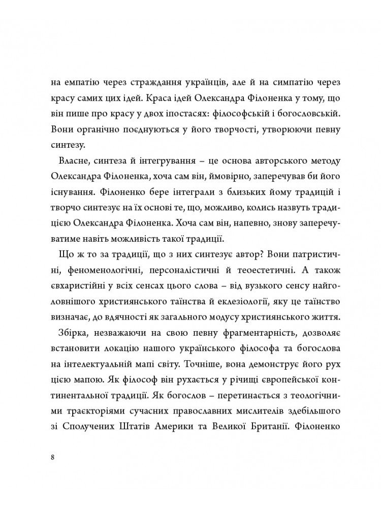 Хіба є щось більш упевнене, що свідчить про існування Бога, ніж краса, що оточує нас? Ми бачимо Його відображення у заході сонця та у творах великих живописців, у музиці, яка пробуджує душу, та у крапельках роси на польових квітах. Споглядання прекрасного, дяка, радість – це особливий вид молитви, яка завжди з нами. Ця книга – не лише дослідження богослов’я краси, а й запрошення до особистої подорожі. Вона показує, що сучасна українська філософія та богослов’я є невід’ємною частиною світового інтелектуального ландшафту. У години випробувань такі тексти стають лучом надії – нагадуванням про силу думки та духовного пошуку, що допомагають не лише осмислювати світ, а й чинити опір його руйнуванню. Що ви знайдете в книжці: Несподівані висновки та глибокі роздуми про природу Божественної краси. Свідчення Дмитра Сторцева про Київський літній богословський інститут. Нові горизонти сприйняття Бога та світу за підказками пана Філоненка Передмову Архимандрита Кирила Говоруна. Кому буде цікава ця книга Тім, хто цікавиться сучасним богослов’ям та філософією. Людям, які прагнуть побачити Бога у кожному прояві життя навколо. Всім, хто небайдужий до краси і шукає глибше її осмислення.