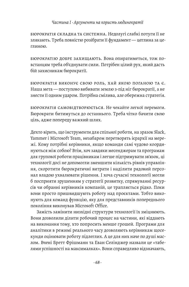 Компанії, особливо великі, і досі позбавляються надміру бюрократичними. І це їм шкодити: зміни впроваджуються повільно або й узагалі відсутні; потреби працівників не враховуються, а інноваційних рішень не народжується, бо такі установи не надихають. Як таким організаціям стати креативними, гнучкими, сучасними? Створити іншу бізнес-модель — децентралізованої людиноцентричної організації з мінімальним формалізмом, іншим перерозподілом відповідальності; динамічністю на всіх рівнях; меритократією; відчуттям власного ком’юніті всередині компанії тощо. І ця нова модель орієнтується не на бюрократію, а на людинократію на основі своїх принципів. Людинократія, згідно з авторами, це така форма організації робочого процесу, за якою людський внесок у компанії є найвищим, основним акцентом її діяльності.