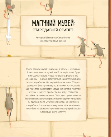 Нумо навздогін за магічним скарабеєм! Хтось вважає музеї цікавими, а хтось нудними. А якщо сповнити музей магії та чарів — це буде щось інше. Якщо не вірите, розгорніть цю книжку — і щось трапиться. Закляття священного скарабея подіє: музейні експонати Стародавнього Єгипту оживуть, а з ними котик, який ще пам’ятає Клеопатру. Завдання котика полягає в тому, щоб все привести в лад, спіймати скарабея та зняти закляття. Втім, ця справа нелегка. Разом із котиком та сірими помічницями-ведмедиками ви пробіжитеся музеєм навздогін за чарівним скарабеєм. На цьому шляху мимохідь ви дізнаєтесь багато цікавого про неймовірну цивілізацію Стародавнього Єгипту.