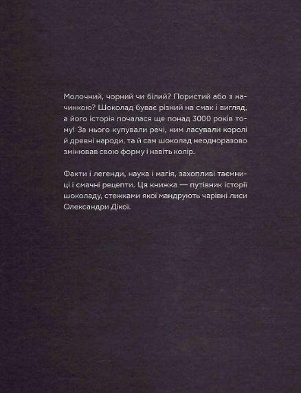 Молочний, чорний чи білий? Пористий чи з начинкою? Шоколад буває різний на смак і вигляд, а його історія почалася ще понад 3000 років тому! За нього купували речі, ним ласували королі та давні народи, та й сам шоколад неодноразово змінював свою форму і навіть колір. Факти та легенди, наука та магія, захопливі таємниці та смачні рецепти. Ця книжка – путівник історії шоколаду, стежками якої мандрують чарівні лисиці Олександри Дікої.