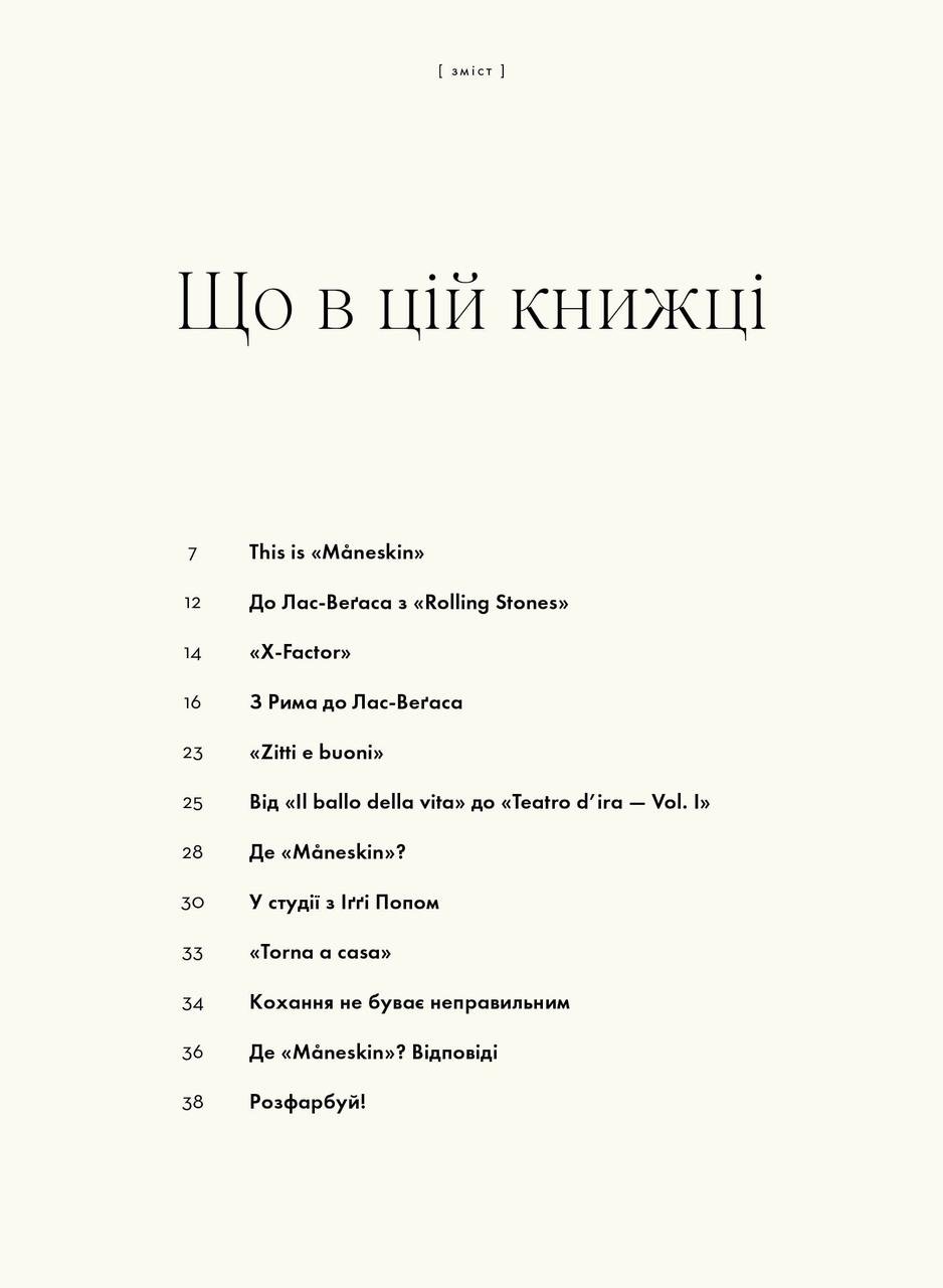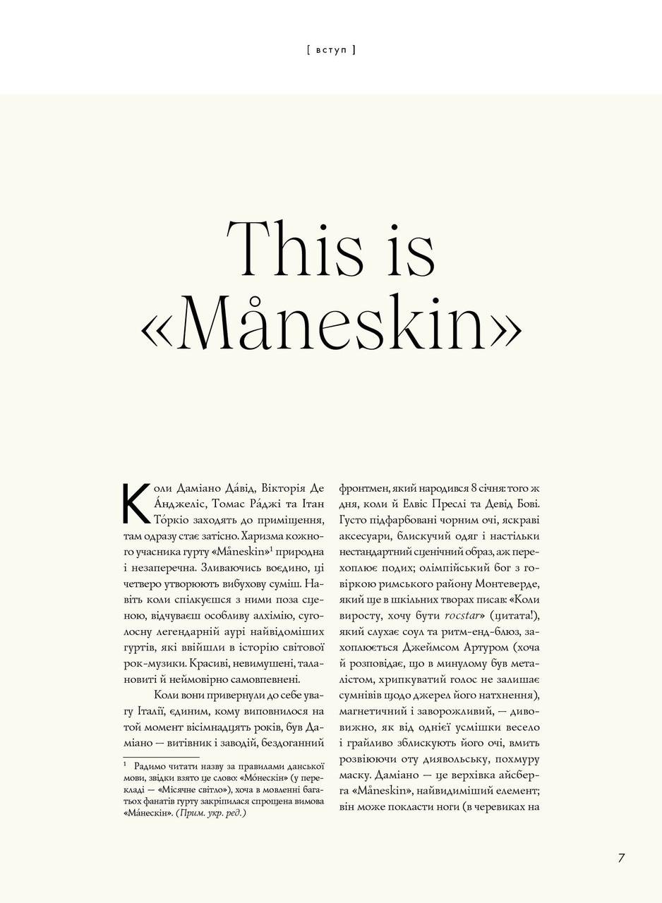 «Måneskin» народжені бути зірками. І якщо колись, на початку своєї кар’єри, так поважали лише самі учасники гурту, то тепер у цьому переконань увесь світ. Від імпровізованих виступів на вулицях Риму до найвідоміших сцен та перемоги на «Євробаченні»… Журналістка «Rolling Stone» Ґія Кортасса на сторінках цього фанбука простежила за неймовірним злітом шаленої італійської четвірки, яка перевернула уявлення про сучасну рок-музику. Безкомпромісно відкидаючи всі авторитети, Måneskin з найвищих сходинок світових чартів впевнено заявивши: рок — це ми. Крім історій про гурт та його успіхи, ви знайдете у фанбуці комікс із запальними італійцями, вімельбух, розмальовку та постер.