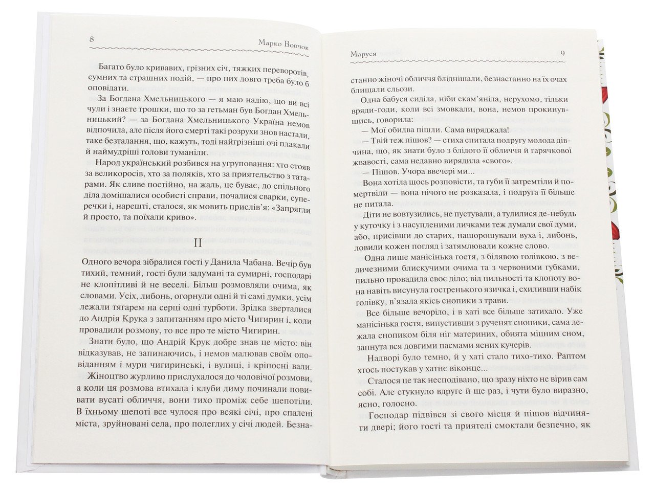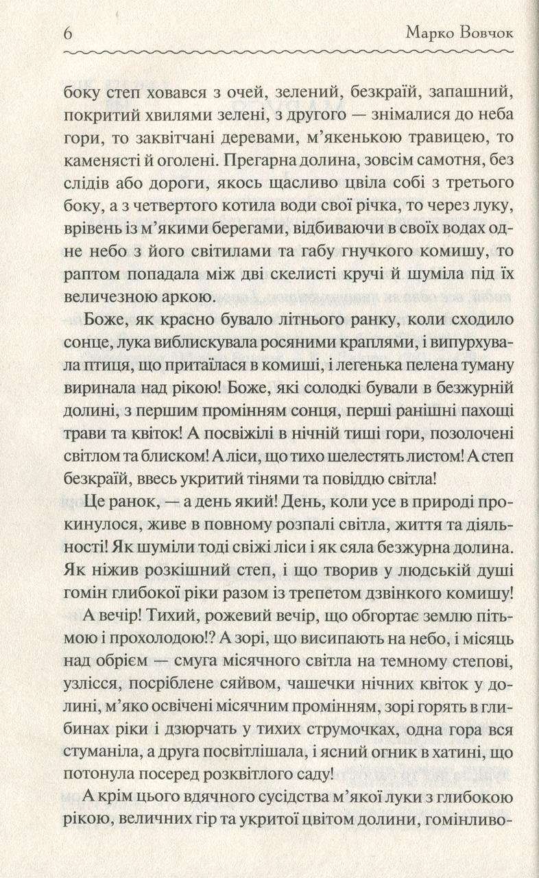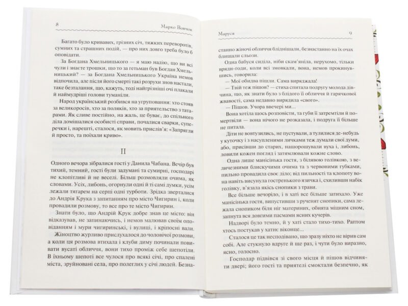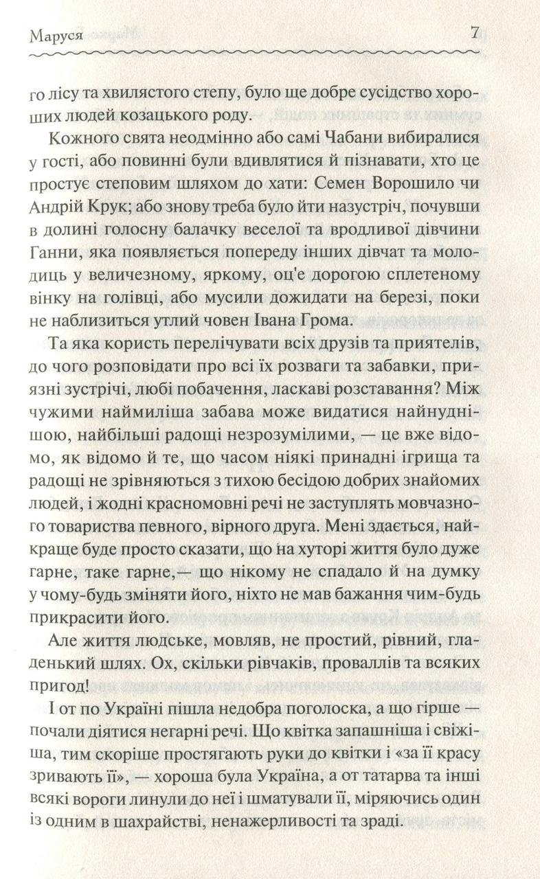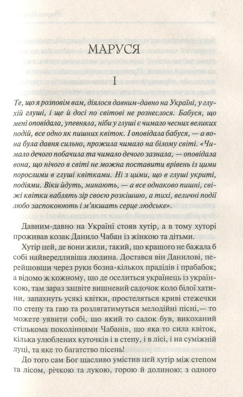 …Те, що я розповім вам, діялося давним-давно в Україні, у глухій глуші, і ще й досі по світові не рознеслося. Бабуся, що мені розповідала, упевняла, ніби у глуші є чимало чесних великих подій, все одно як пишні квіти. І розповідала бабуся, а вона була давня сильно, прожила чимало на білому світі. «Чимало чогось побачила та чимало чого зазнала, — розповідала вона, що нічого в світі не можна поставити врівень із цими порослими в глуші квітками. Ні з цими, що в глуші укриті, подіями. Віки йдуть, минають, — а всі однаково пишні, свіжі квітки манять зір своєю розкішшю, а тихі, величні події любо заспокоюють і м’якшають серце людське». Про автора: Марко Вовчок — псевдонім української письменниці Марії Вілінської. Тарас Шевченко називав її своєю донькою, Пантелеймоном Кулішем – мовчазним божеством, а Віктор Домонтович охрестивши моцартом любовних історій. Вона була єдиною в українській літературі жінкою-письменницею наприкінці 50-х років ХІХ століття. Її повість «Маруся» отримала нагороду Французької Академії і була перекладена багатьма мовами. Майже 40 років Марко Вовчок була постійним співробітником журналу Magasin d’Education et de Recreation, у якому друкувався Жуль Верн.