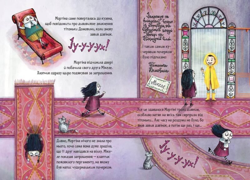Мортіна та її найкращий друг — пес Смуток породи левретка-альбінос живуть із тітонькою Домовиною і цілісінькі дні бавитися з привидами на Покинутій віллі. Та одного дня Мортіну спіткала неприємність. Ні з того, ні з сього, діти з селища, друзі Мортіні, завітали на віллу, бо отримали загадкові запрошення. І це саме тоді, коли тітонька Домовина десь зникла. А тут ще й де не взявся страшенно вередливий кузен Ділберт, який приїхав їх провідати.