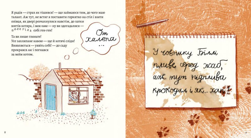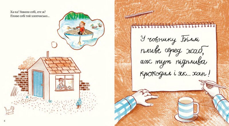 Цей розповідь відкриває завісу над захопливим і часом зовсім непередбачуваним процесом народження літературних творів. Іноді шлях від задуму до готового видання перетворюється на справжню пригоду, де первісний задум автора може змінитися до невпізнаваності. Головний герой Аллан спочатку вигадав історію про зубастого крокодила, проте видавець вирішив, що динозавр буде виглядати набагато ефектніше. На цьому сюрпризи не закінчилися, адже ілюстратор втілив образи героїв у зовсім іншому стилі, ніж малювала уява письменника. Коли нарешті довгоочікуваний примірник з’явився на світ, автор ледь дізнався в ньому власну ідею. Побачивши результат спільної праці цілої команди, він спершу назвав цей витвір своїм найгіршим досягненням. Ця кумедна та неймовірно життєва історія допомагає дітям зрозуміти складний механізм створення книжок та роль кожного фахівця у цій справі. Через іронічні ситуації читачі дізнаються про важливість компромісів та творчої співпраці.