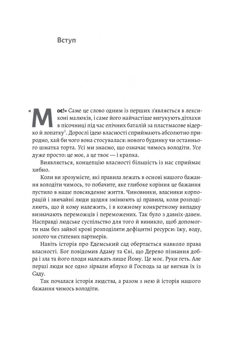 Що таке власність? Що саме ми можемо назвати «своїм» — де межі наших володінь? Здавалося б, слово «моє» ми засвоюємо ще в дитинстві. Проте все набагато складніше. Власність не є ані постійним поняттям, ані чітко окресленим: навіть у різних штатах США поняття того, чим саме ти володієш, є розмитим. Автори цієї книжки надають цікаві роздуми щодо зрозуміти власності, розповідаючи, як символічне володіння іноді може підміняти справжнє, а деякі компанії заробляють, роблячи власністю зовсім не об’єктні явища, наприклад, відсутність потреби стоять у черзі. Чим гарна ця книжка Книга розповідає про власність з кількох різних точок зору: економічної, соціальної, політичної, культурної, юридичної, психологічної. Тому читати її досить цікаво, аби отримати повну картину уявлень про поняття власності. Книга пояснює кілька правових прецедентів простими словами, показуючи з їх допомогою, що питання власності виникає майже повсеместно.