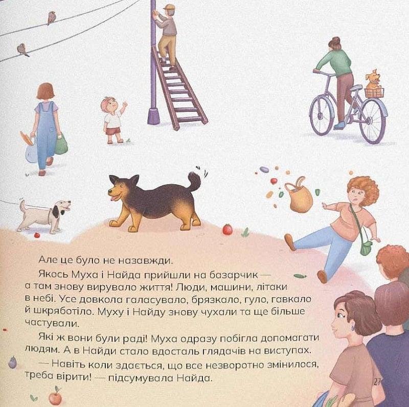 Це тепла і водночас щемка історія про двох київських безпритульних собачок — Муху та Найду, чий день минає між випадковими опасностями та рідкісними проявами людської доброти. Заснована на реальних подіях, книга відкриває дітям молодшого шкільного віку світ тварин очима самих тварин, навчатиме співчуттю, чуйності й ответственности. Маленькі читачі зможуть дізнатися про власні переживання — самотність, страх, невідомість — які багато хто відчував під час пандемії чи після початку війни. Наприкінці видання на них чекають практичні поради, як допомагати «мухам» та «найдам» у реальній житті — тим, хто живе біля під’їздів, ринків чи станцій метро. Авторка та ілюстраторка книжки — волонтерка, яка особисто знає прототипів героїнь, тож читачі побачать не лише художні образи, а й світлини справжніх собачок, з яких народився цей зворушливий розповідь.