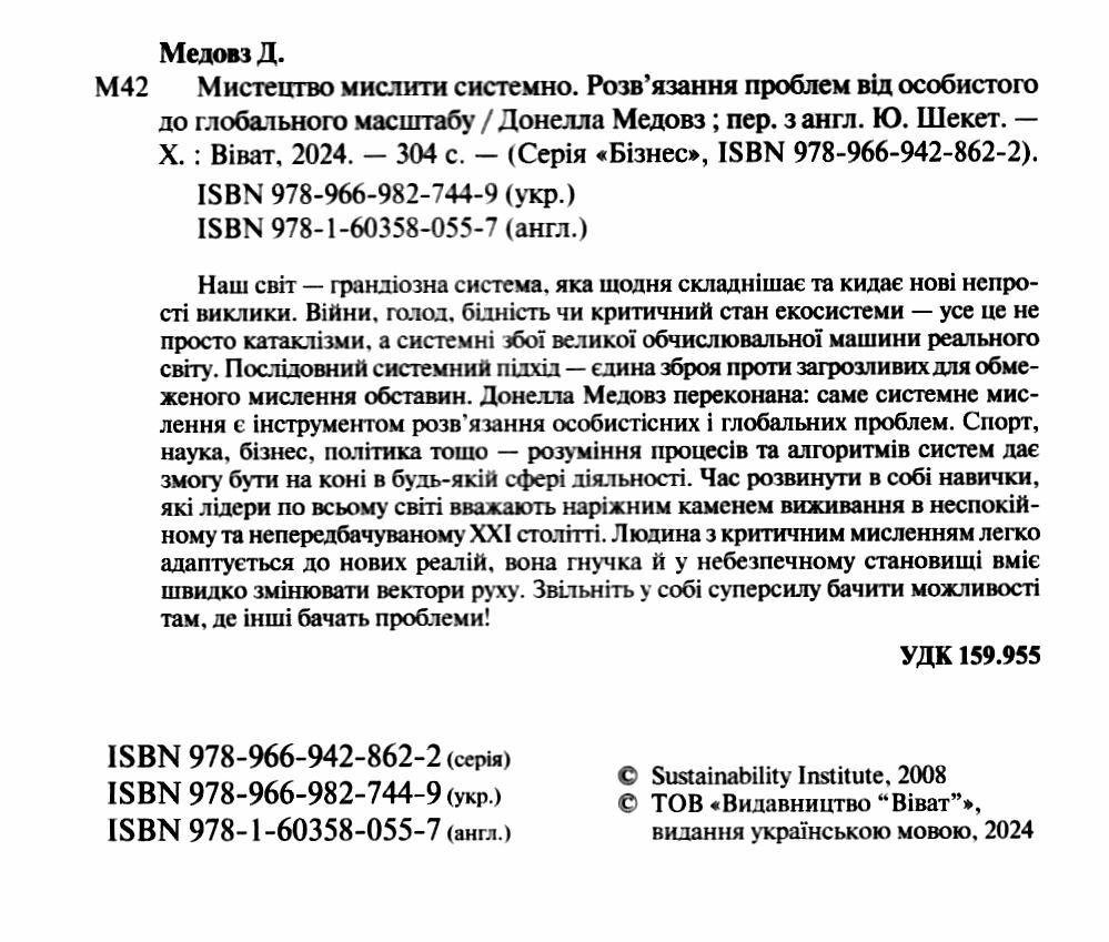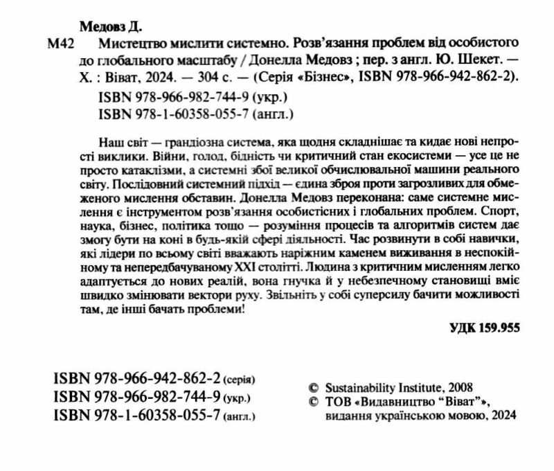 Наш світ — грандіозна система, яка щодня складнішає та кидає нові непрості виклики. Війни, голод, бідність чи критичний стан екосистеми — це не просто катаклізми, а системні збої великої обчислювальної машини реального світу. Послідовний системний підхід — єдине зброя проти загрожливих для обмеженого мислення обставин. Донелла Медовз упевнена: саме системне мислення є інструментом розв’язання особистісних та глобальних проблем. Спорт, наука, бізнес, політика тощо — розуміння процесів та алгоритмів систем дає змогу бути на коні у будь-якій сфері діяльності. Час розвинути в собі навички, які лідери по всьому світу вважають наріжним камнем виживання у неспокійному та непередбачуваному ХХІ столітті. Людина з критичним мисленням легко адаптується до нових реалій, вона гнучка і в небезпечному становищі вміє швидко змінювати вектори руху. Звільніть у собі суперсилу бачити можливості там, де інші бачать проблеми!