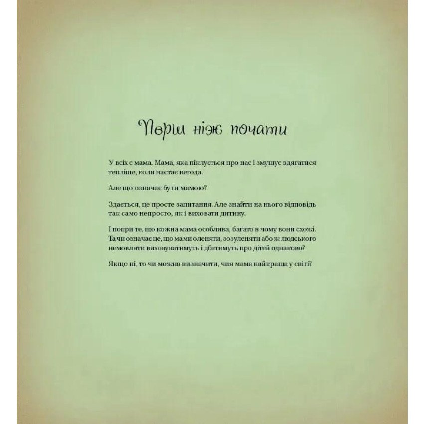 Є тисяча один спосіб бути мамою. Але який найкращий? Шукайте відповідь серед цих милих зображень матерів та розповідей про них. У всіх є мати. Мама, яка піклується про нас і змушує вдягатися тепліше, коли настає негода. Але що означає бути мамою? Здається, це просте запитання. Але знайти на нього відповідь так само непросто, як і виховати дитину. І незважаючи на те, що шкірна мама особлива, багато в чому вони схожі. Та чи означає це, що мами оленяти, зузуляняти або ж людського немовляти виховуватимуть і дбатимуть про дітей однаково? Якщо ні, то можна визначити, чия мама найкраща у світі? А що, як, нарешті, найкращою є та мама, яка просто любити тобі?