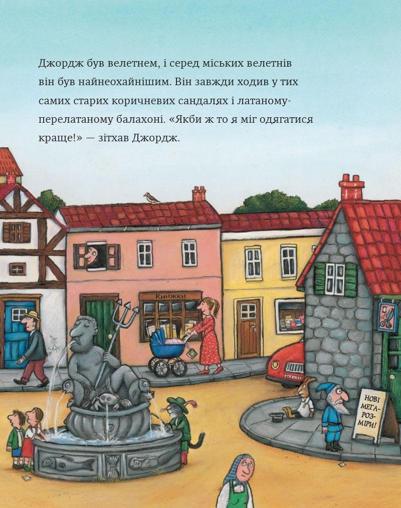 Велетень Джордж завжди був найбруднішим великаном у місті, аж поки одного разу не вирішивши: досить! Один візит до крамниці новенького одягу — і ось перед нами вже не кудлатий великан, а справжній джентльмен у стильній сорочці, модних штанях та блискучих черевиках. Джордж сяє від щастя і гордо крокує вулицями, насолоджуючись своїм новим виглядом. Проте його прогулянка перетворюється на справжнє випробування для гардеробу, коли він зустрічає лісових мешканців у біді. Виявляється, що його новий галстук — ідеальний шарф для замерзлої жирафи, черевик — затишна домівка для батьківщини ведмедиків, а ремень може врятувати песика від трясовини. Один за одним елементи його найстильнішого костюма стають спасінням для друзів. Джордж буквально роздає свій стиль по шматочку, доки знову не залишається у старій латаній туніці. Але саме в цей момент він усвідомлює: хоча він більше не найстильніший ззовні, він став найщасливішим усередині.