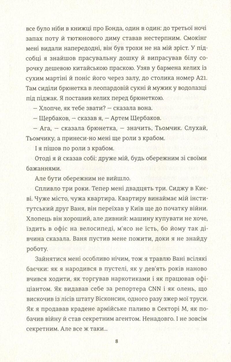 Дебютний роман співзасновника видання «Бабель» є спробою змалювати чесний портрет сучасного покоління. Головний герой зростає в епоху повалених режимів, де старі правила вже не діють, а нові ще не написані. Він кидається з крайнощів у крайнощі в надії заглушити внутрішню порожню. Артем щиро описує свої чисельні романи та сумнівні заробітки. Його історія показує трансформацію вчорашнього підлітка, який пройшов шлях від травми дитинства до війни на сході України. Книга ставить питання про те, де проходити межу між правдою та вигадкою у життя людини без твердого ґрунту під ногами.