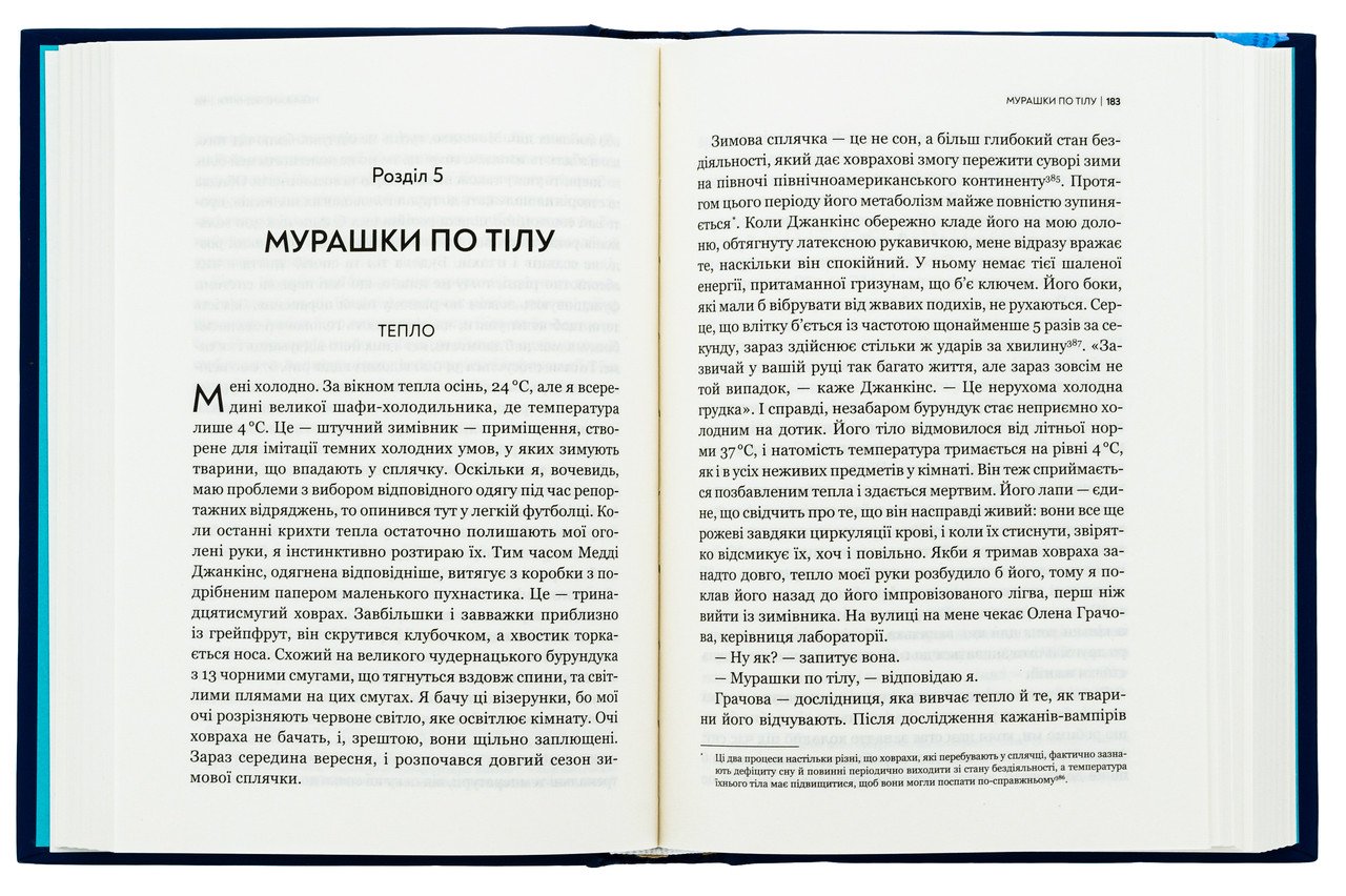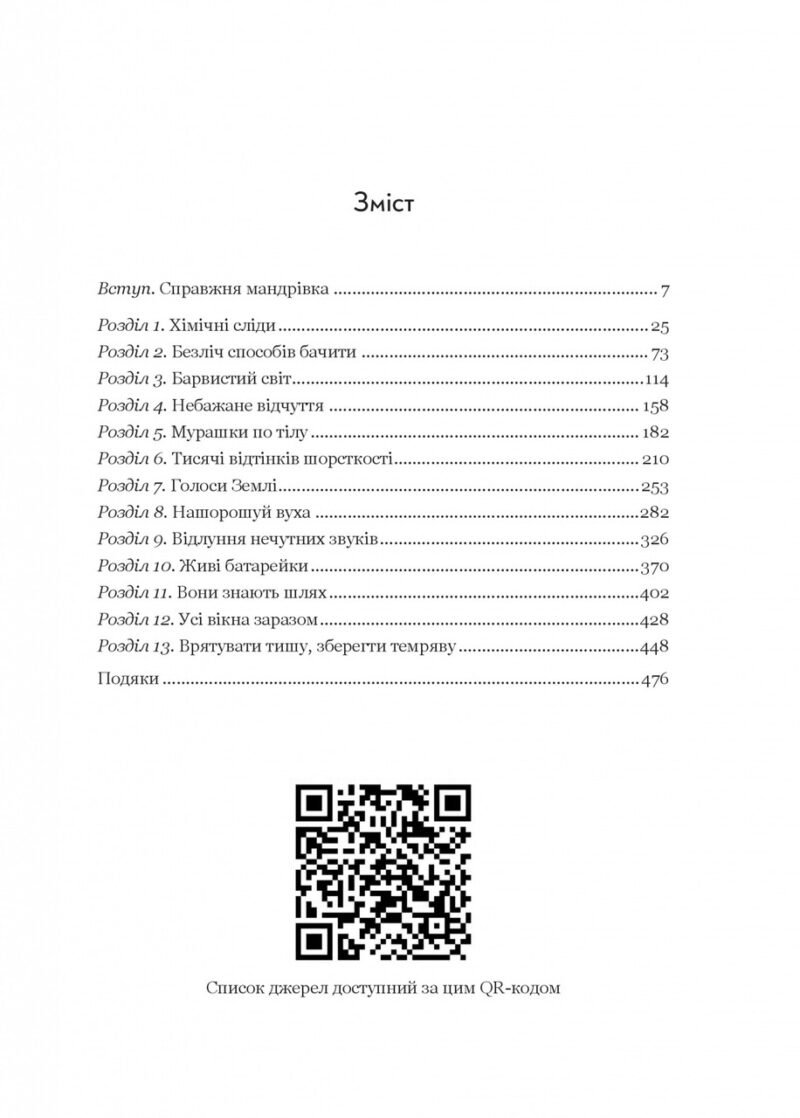 Ця книжка допоможе дізнатися про здібності тварин, що раніше вважалися неможливими чи фантастичними. Ви будете вражені, наскільки по-різному бачать і відчувають світ планети Земля тварини. Як тварини використовують свої органи чуття? Нюх і смак? Прикмети, вібрацію, слух? А як вони бачать? Який їхній світ кольорів? Автор допомагає зазирнути всередину видосвітів тварин та відкрити чимало таємниць. Ви зустрінете жуків, яких приваблює дим, та морських черепах, здатних відчувати магнітні поля Землі. Дізнаєтеся, що крокодили виявляють найменші брижі на поверхні води, що очі гігантського кальмара еволюціонували, щоб бачити китів; що рослини гудять тихими вібраційними піснями, і що навіть прості морські гребінці мають складний зір. Довідаєтеся, що бачать пчелі у квітах, що чують співочі птиці у своїх мелодіях і що винюхують собаки на вулиці. Багато тварин, чиї видосвіти найбільше відрізняються від наших, живуть у важкодоступних чи непрохідних місцях — мутних річках, темних пещерах, відкритих океанах, бездонних глибинах та підземних просторах. Запрошуємо поринути в цей дивовижний неосяжний світ.