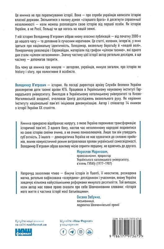 Ця книжка — не про чужий погляд на історію, а про те, як українці пишуть свою. Вона про шлях до справжньої незалежності, коли можна розповідати власну історію без впливу «старшого брата». Автор зібравши статті, колонки та інтерв’ю за останні десятиліття, доповнивши їх сучасними висновками. Тематика охоплює національну самосвідомість, Голодомор, освободну боротьбу, революції, Євромайдан та архівні матеріали, що стали доступними. Це книжка про минуле й сучасне, колективне й особисте, про історію як процес і як оповідь. Автор – Володимир В’ятрович, історик, дослідник освободного руху, громадський діяч, який посвятив свою діяльність відновленню національної пам’яті України.