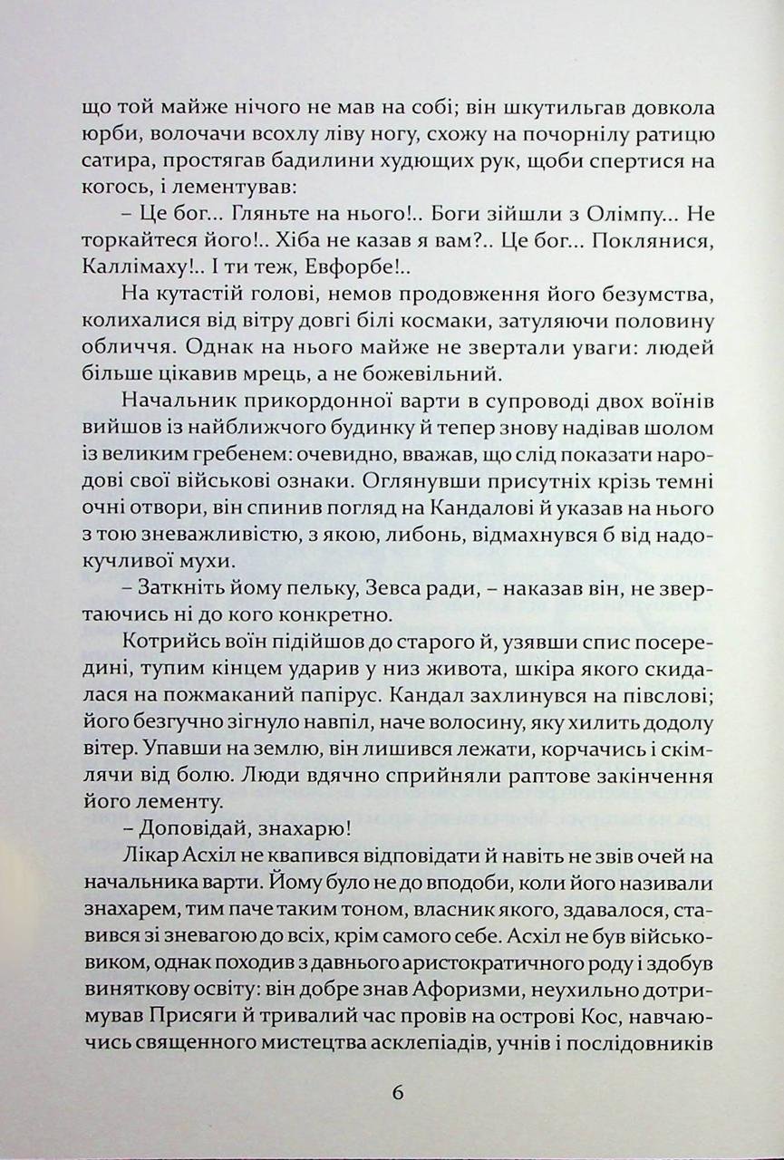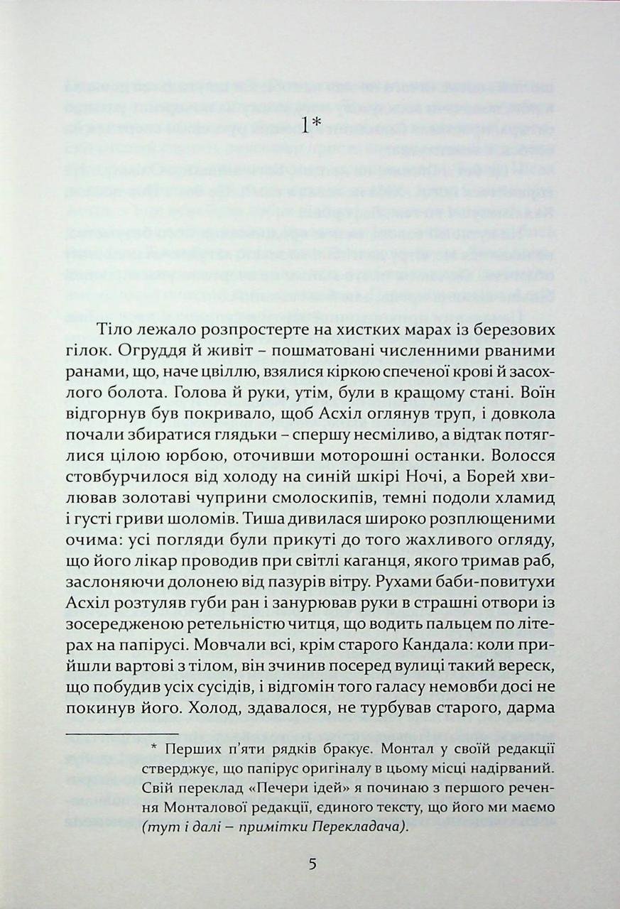 Паралельно розгортається сюжетна лінія сучасності. Перекладач, що працює над давньогрецьким манускриптом про смерть Трамаха, виявляє, що його попередник загинув за дивних обставин. Робота над текстом перетворюється на небезпечне розслідування: античні рядки виявляються зашифрованим посланням, а сама структура твору — лабіринтом, що веде до розгадки.