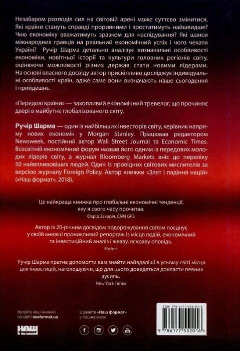 Незабаром розподіл сил на світовій арені може суттєво змінитись. Які країни стануть справді проривними і зростатимуть найшвидше? Чию економіку можна вважати зразком для наслідування? Які шанси міжнародних гравців на реальний економічний успіх, і чого чекати Україні? Ручір Шарма детально аналізує визначальні особливості економіки, новітньої історії та культури головних регіонів світу, оцінюючи можливості різних держав стати новітніми лідерами. На основі власного досвіду автор прискіпливо досліджує індивідуальні особливості країн, адже саме вони визначають наше сьогодення та прийдешнє. Автор близько 20 років подорожував світом, щоби на власному досвіді ознайомитися з економічними реаліями різних країн. «Передові країни» — захопливий економічний тревелог, що прочиняє двері у майбутнє глобалізованого світу.