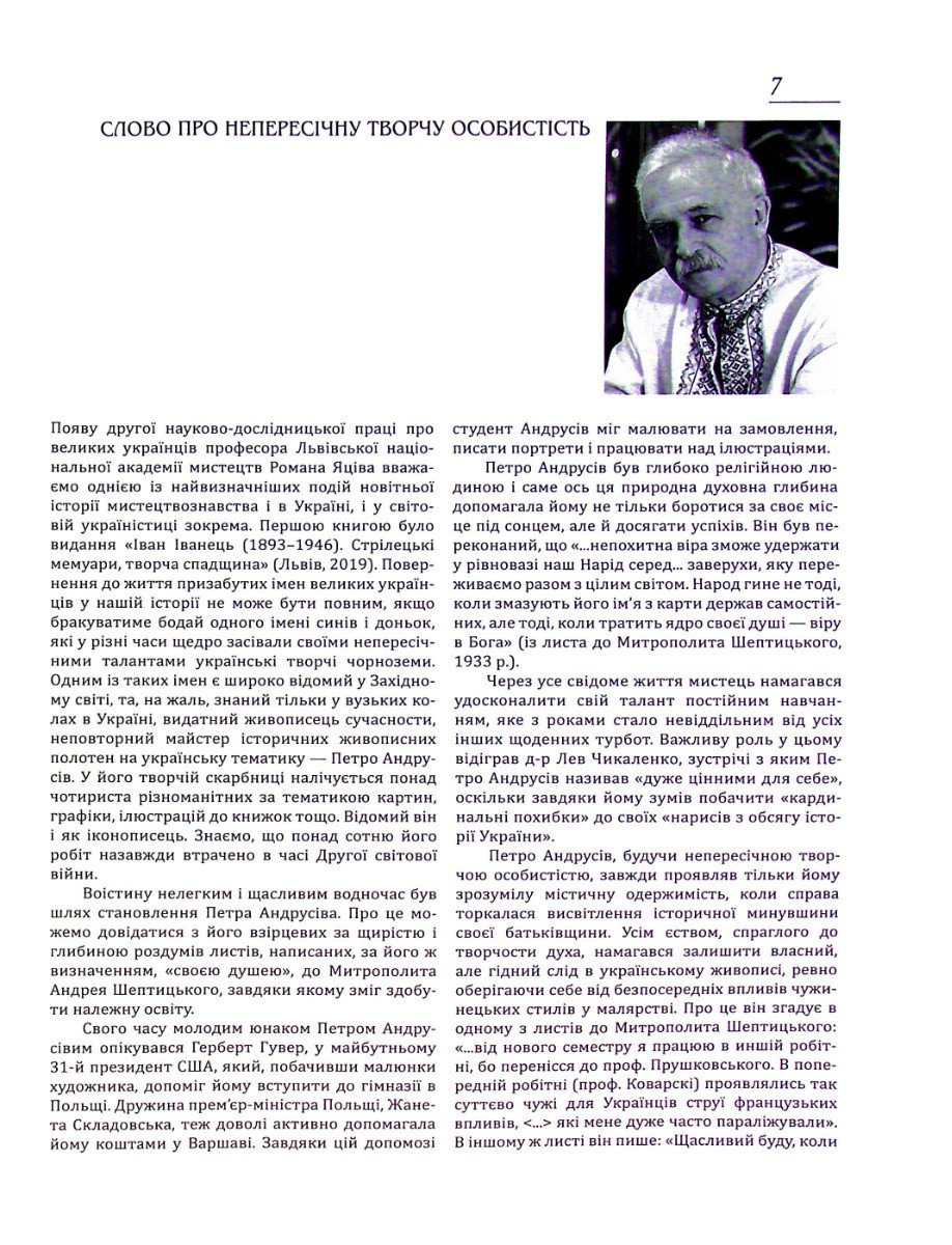 Книга пропонує читачам унікальну можливість ознайомитися з візуальним світом Петра Андрусіва через багату добірку репродукцій його найкращих малярських та графічних робіт. Видання гармонійно поєднує в собі риси художнього альбому та серйозної монографії, дозволяючи не лише милуватися творами мистецтва, а й розуміти контекст їхнього створення. Тут зібрано найбільш значущі за змістом та ідейним наповненням мистецтвознавчі тексти автора, що розкривають його теоретичні погляди. Читач зможе простежити еволюцію стилю художника та оцінити його внесок у розвиток українського образотворчого мистецтва. Книга також містить рідкісні світлини з родинного архіву, які додають оповіді особистісного виміру і наближають постать творця до сучасної аудиторії. Це видання буде цікавим як для професійних практиків мистецтва, так і для широкого кола шанувальників прекрасного, які цікавляться історією культури.