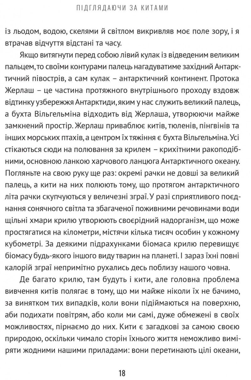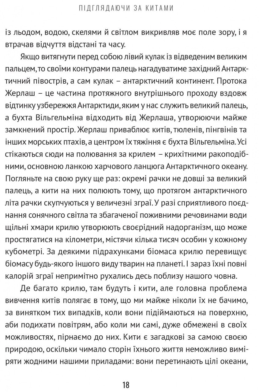 Що ми знаємо про китів, про їхній еволюційний шлях, про розміри, про те, де і як живуть, як полюють, приводять на світ дитинчат; які труднощі долають чи які опасности на них чигають в океанських просторах? На ці та інші запитання дає відповіді відомий знавець китів Нік Пайєнсон у своїй книжці «Підглядаючи за китами». Як справжній фанат китів автор брав участь у наукових експедиціях і досліджував скам’янілості, знайдені в різних куточках планети: від чилійської пустелі Атакамі, де виявлено найбільше у світі поховання залишків китів – Серро Баллена, до китобійних станцій в Ісландії, від північних Тому він так захопливо розповідає про те, як виглядали давні кити, як вони, мешкаючи на суші мільйони років тому, повернулися назад до водного способу життя; наскільки вражають розміри їх тіл. А ще – вони спілкуються між собою незбагненними людству мовами. Вони, як і ми, творять культуру. І все це – звідки з’явилися киті, як живуть сьогодні, що з ними станеться у новій ері – ми знайдемо у цьому нарядному томіку.