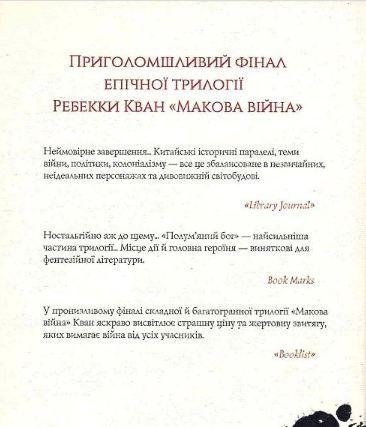Приголомшливий фінал епічної трилогії Ребеккі Кван Макова війна. Після звільнення Нікарської імперії та запеклої громадянської війни союзники Жиньavилися її, залишивши померти. Однак шаманка-спірлійка находитиме підтримку у жителів південних провінцій, особливо жителів її рідного села Тікань. Вона швидко розуміє, що справжня сила імперії — в руках мільйонів простих людей, які прагнуть декору, а її поважають як богиню-рятівницю. Жинь використовує все доступне їй зброю, щоб нанести враження Республіці Дракона, колонізахідникам і всім, хто несе загрозу шаманічним мистецтвам. Її сила та вплив зросттимуть, але як довго вона зможе протидіяти п’янкому голосу Фенікса, який підбурює спалити все довкола? “Неймовірне завершення… Китайські історичні паралелі, теми війни, політики, колоніалізму — все це збалансовано у незвичайних, неідеальних персонажах та дивовижному світизуванні”. Library Journal