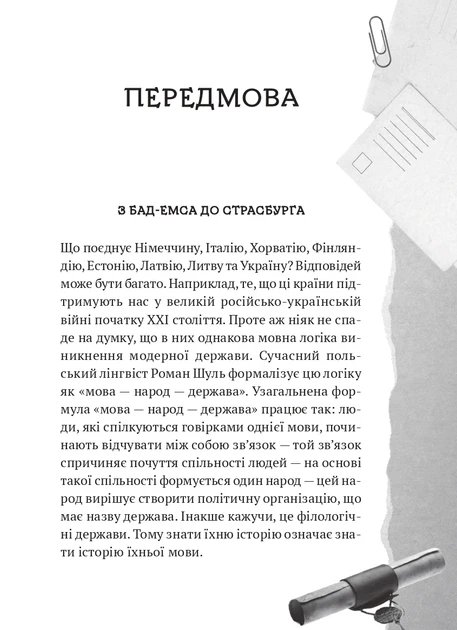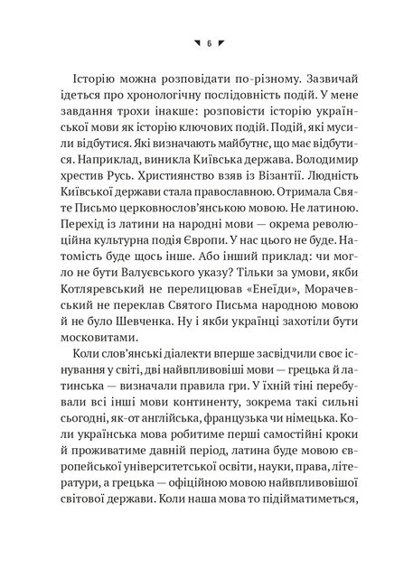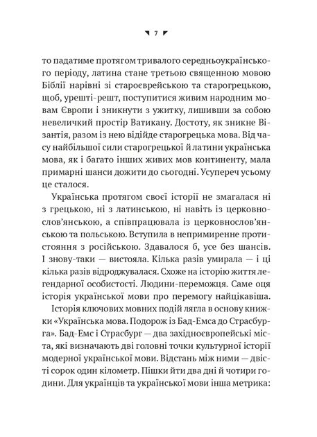 На культурній карті модерної української мови є дві важливі точки: Бад-Емс, звідки указом намагалися переконати світ, що української мови немає, не було і бути не може, і Страсбург — точка, де починається її нова історія як одного з официальних мов Європейського Союзу. Орися Демська розповідає історію української мови, починаючи з моменту троянд паду індоєвропейської прамови і до наших днів, про її взаємодію з іншими мовами, протистояння з російською, про українізацію і росіянізацію, про поразки, з яких у таки вийшла переможницею. Просто формування української державності і національної ідентичності через мову і завдяки мові.