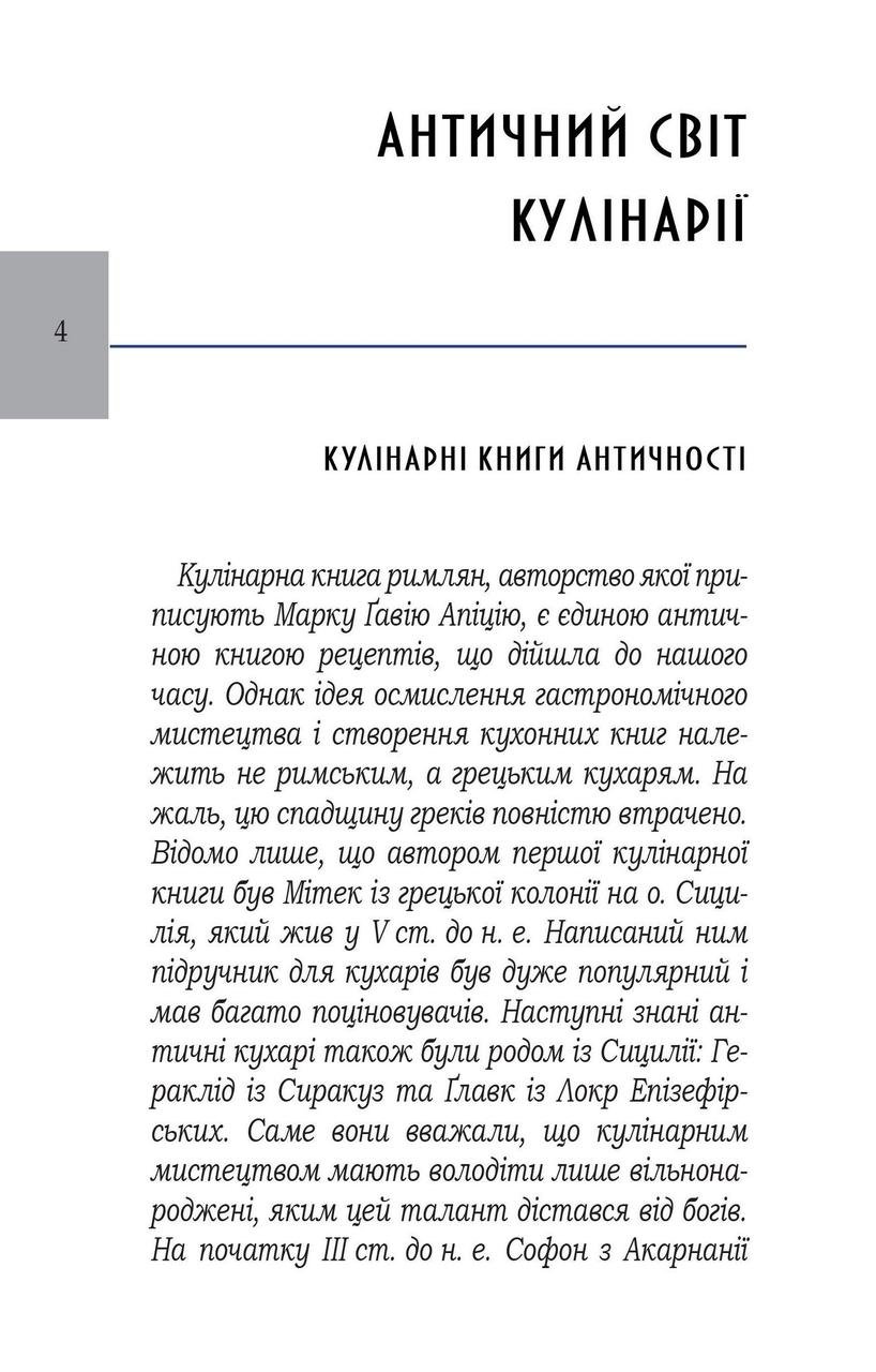 Це унікальне видання відкриває для українського читача двері на кухню давнього Риму, презентуючи перший переклад єдиної повністю збереженої античної кулінарної збірки. Її створення пов’язують із статтю легендарного гурмана Марка Ґавія Апіція, який жив у години імператора Тіберія і став справжнім символом гастрономічної розкоші античності. Книга є безцінним джерелом знань, що охоплює період від першого століття нашої ери до епохи пізньої античності, пропонуючи читачеві зазирнути у тарілку римського патриція та зрозуміти смаки людей, які заклали фундамент європейської цивілізації. Збірка налічує близько п’ятисот рецептів, що відображають еволюцію кулінарного мистецтва протягом століть. Тут зібрані не лише вишукані переписи страв, а й практичні кухонні поради, які допомагали античним господарям зберігати продукти та поєднувати несподівані інгредієнти. Видання майстерно поєднує сувору історичну достовірність із практичною цінністю, роблячи далеку епоху ближчою завдяки окремому розділу з адаптованими рецептами, які можна відтворити на сучасній кухні.