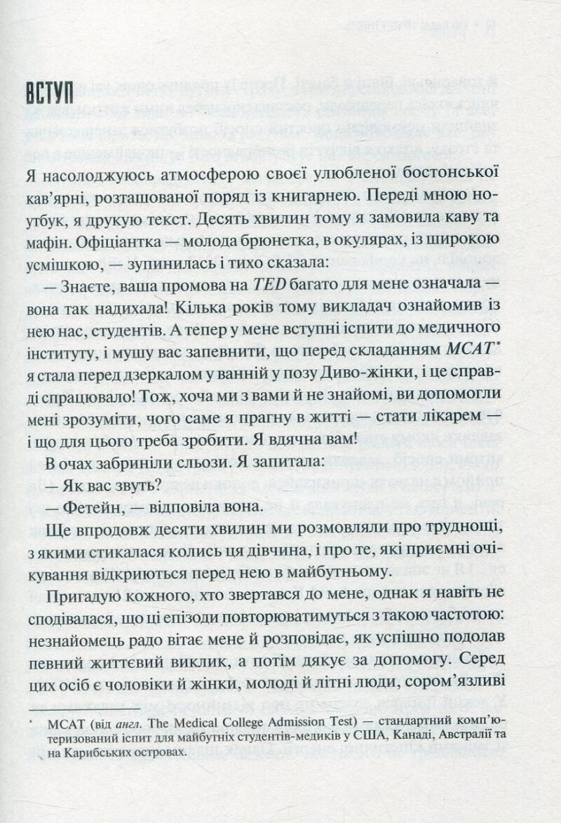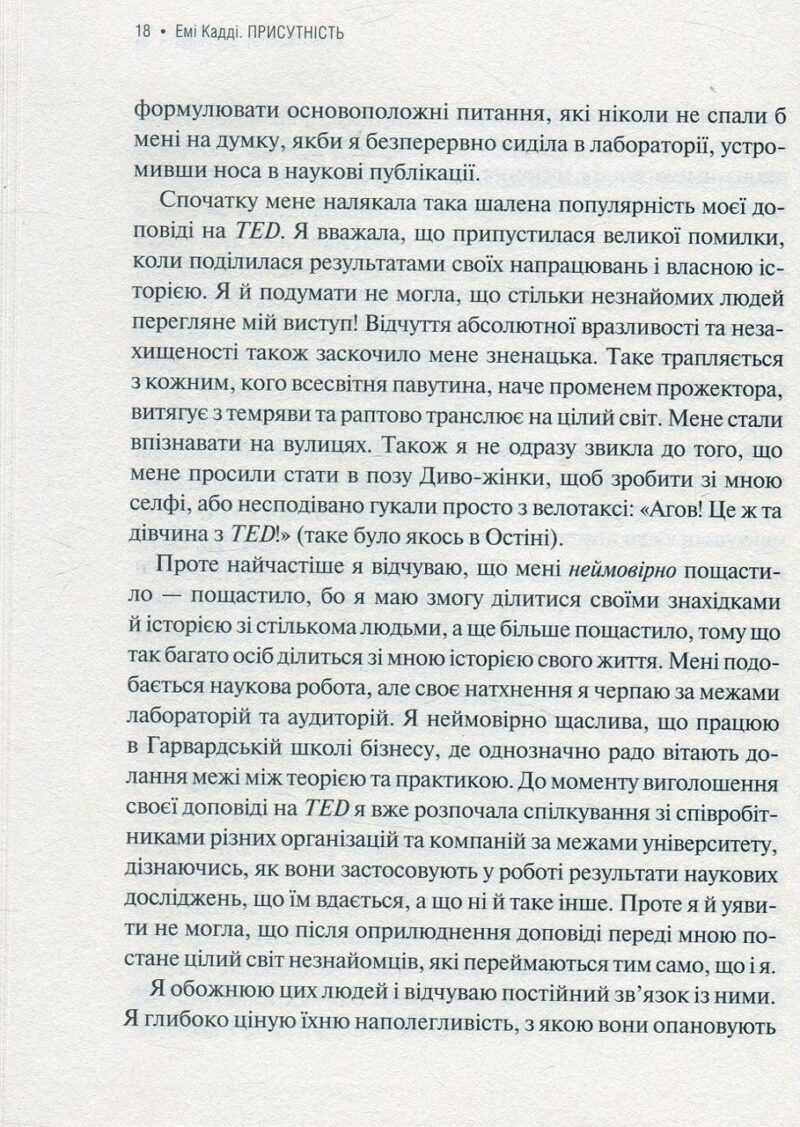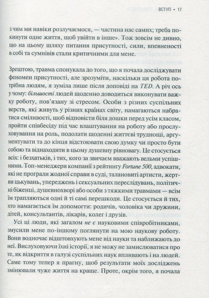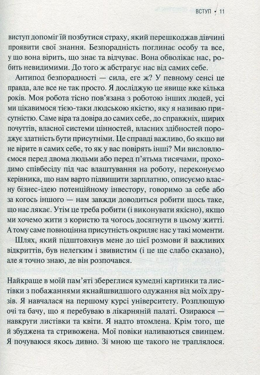 М Считаєте, що позбутися тривоги й безглуздих передчуттів у стресових ситуаціях неможливо? Мрієте навчитися впевнено долати перешкоди, вірити у власні сили, радіти життю та контролювати своє тіло? Емі Кадді, відомий фахівець із соціальної психології, авторка цікавих праць із психології та розвитку особистості, розповідає, як навчитися «бути присутнім»: • Як позбутися сумнівів у собі та навчитися слухати? • Як усвідомити власну силу і навчитися контролювати своє тіло? • Як стати господарем своєї життя і досягти життєвих вершин? • Як працювати над собою, щоб змінитися самому та змінити життя на краще?