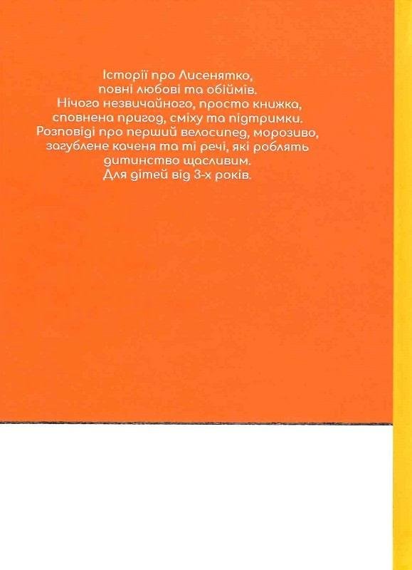 Мила книжка з історіями про Лисенятко. Затишна, мов обійми. Шкіряне маленьке лисенятко впізнає собі і ще раз згадає про те, як сильно його любити. Цілих сім рудих історій про щось звичайне, проте з надзвичайною любов’ю, адже перший велосипед завжди важливіший за інший, турбуватися про рідних завжди приємніше ніж про себе, поганий настрій завжди приборкають обійми, а вдома завжди краще, ніж у будь-якій подорожі.
