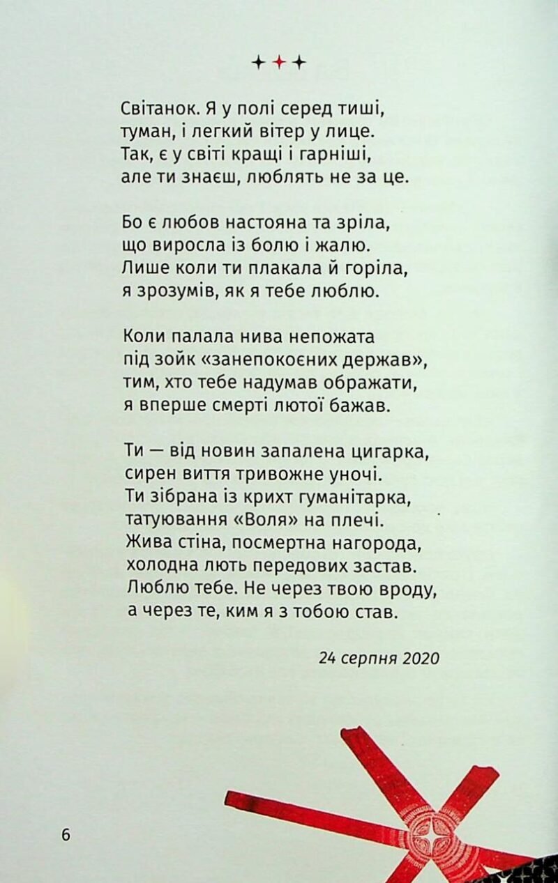 Як написати про війну та любов, втрати та віру? Тільки щиро. Позбавивши бронзований лиск новинам і реквіємам, авторка простими словами говорити про дійсність, у якій живемо. Саме так складаються вірші з надзвичайно глибоким серцем. Вірші, сенси в яких пробирають до кісток, бо промовляти їх буває складно, але треба.