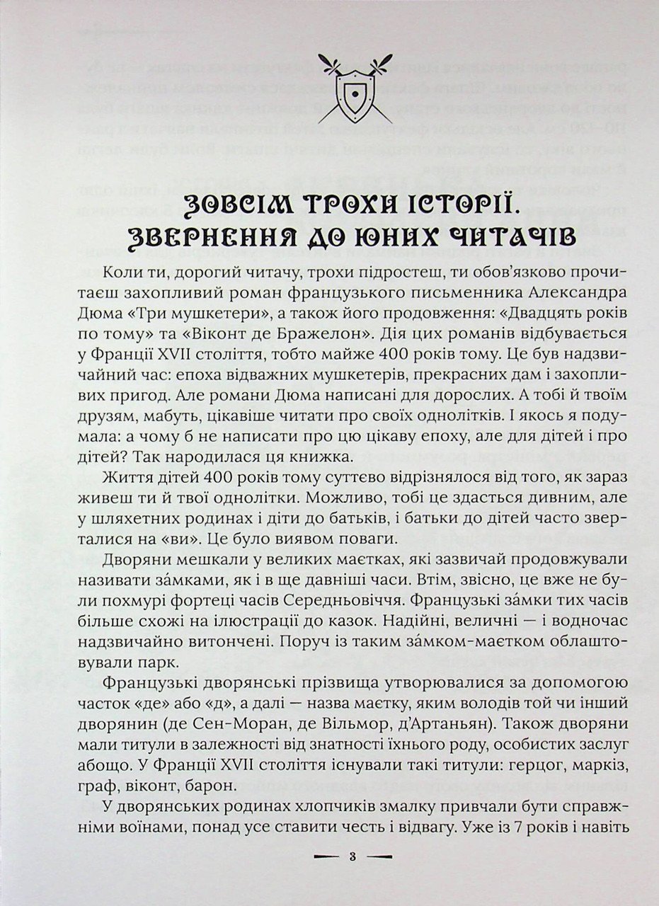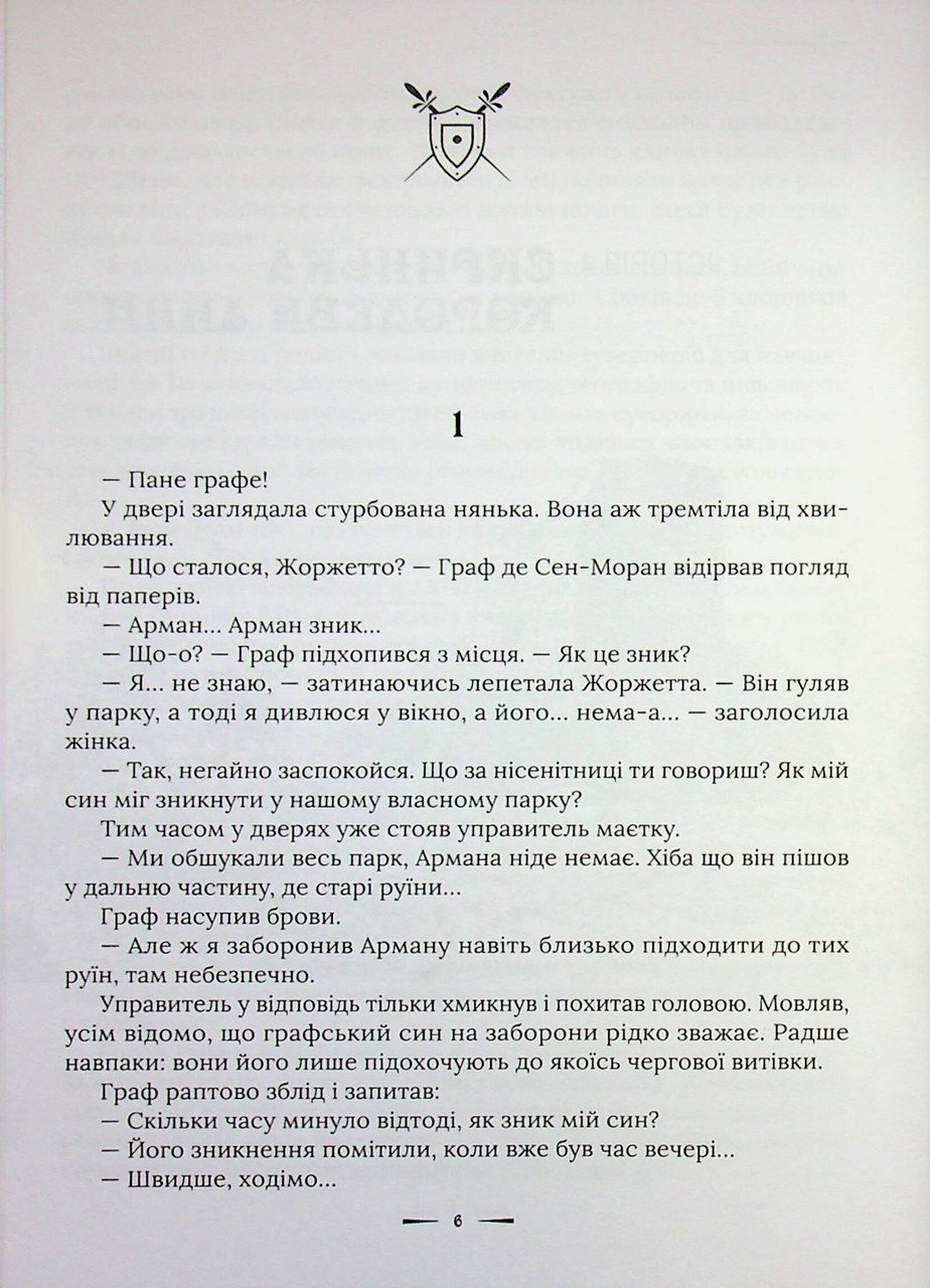 Франція XVII століття постає перед читачем як надзвичайна епоха, де відвага героїв, витонченість прекрасних дам та дух захопливих пригод переплітаються в єдине ціле. Це час величних замків, що нагадують ілюстрації до старовинних казок: вони вражають своєю надійністю та водночас архітектурною витонченістю. Окрасою таких маєтків є розкішні парки, де серед доглянутих алій причаїлися загадкові руїни колишніх фортець, що зберігають таємниці минулих століть. У центрі сюжету виявляється дев’ятирічний Арман та його вірні друзі: відважні брати де Бомон і чарівна Діана, донька баронеси де Вільмор. Самі того не бажаючи, діти стають учасниками небезпечного віру «дорослих» подій, де кожна таємниця може коштувати життя. Їхня дитяча безпосередність стикається із суворими реаліями інтриг та змов, проте юні герої не відступають перед труднощами. Головним рушієм вчинків Армана та його супутників стає кодекс честі: «Шляхетний чоловік завжди має приходити на допомогу слабким і знедоленим». Попри юний вік вони щоразу свідомо наражаються на опасность, демонструючи справжню відвагу та вірність ідеалам рыцарства. Ця книга вчить дитині відповідальності, вмінню розрізняти добро і зло та вірити в силу справжньої дружби, яка здатна подолати будь-які перешкоди. Неймовірна атмосфера епохи мушкетерів та дворових таємниць робить читання динамічним та захоплюючим. Видання ідеально підійде для юних дослідників, які бруднять пригодами та героїчними поступками, адже разом із героями вони пройдуть шлях дорослішання та гартування характеру. Шкірна сторінка цієї історії — це крок у світ, де честь і шляхетність понад усе.