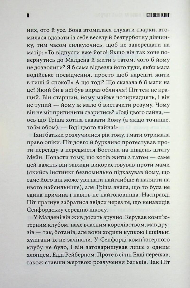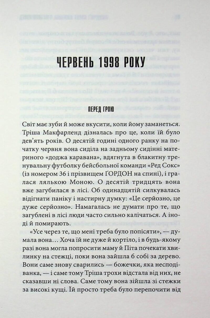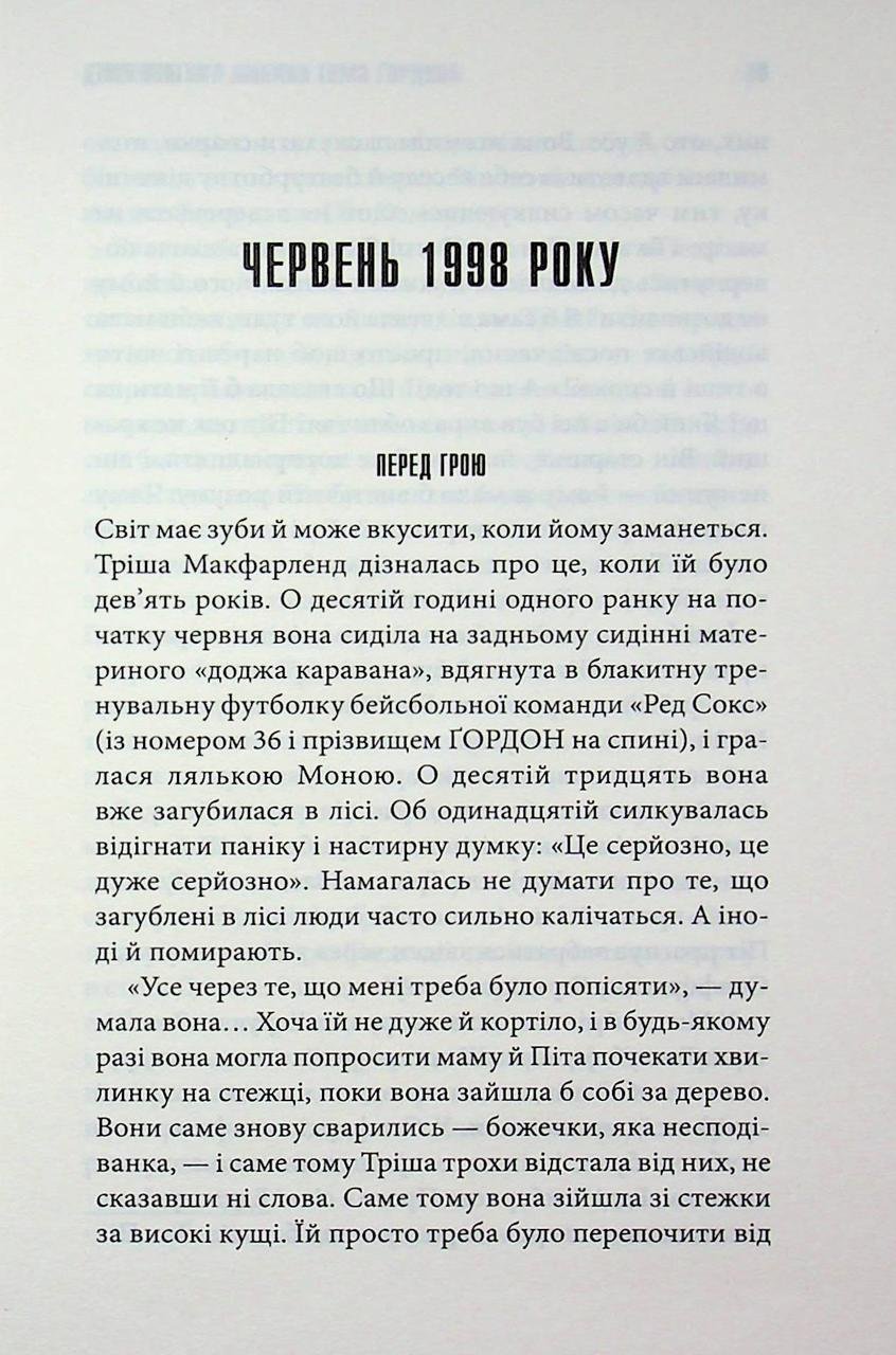 Дев’ятирічна Тріша Макфарленд зробила фатальну помилку: вона просто хотіла скоротити шлях, відлучившись від мами та брата на хвилину. Але ліс, давній і байдужий, має свої закони. Стежка зникає, орієнтири розчиняються, і дівчинка залишається наодинці з дикою природою. Її єдиний зв’язок із цивілізацією — це плеєр, через який вона слухає бейсбольні матчі за участю свого кумира, пітчера Тома Ґордона. У її уяві він стає реальним спутником, єдиним другом, який допомагає не збожеволіти від страху. Проте Тріша не сама у цих хащах. Стівен Кінг майстерно нагнітає атмосферу первісного жаху: дівчинка відчуває, що за нею стежитиме. Це не просто звір, це щось давнє, темне та голодне — Бог Загублених. «Дівчинка, яка любила Тома Ґордона» — це напружений сурвайвал-горор, де межа між реальністю та галюцинаціями стирається від голоду та зневоднення. Чи зможе маленька дівчинка виграти свій найважливіший інінг проти супротивника, який набагато сильніший за неї?