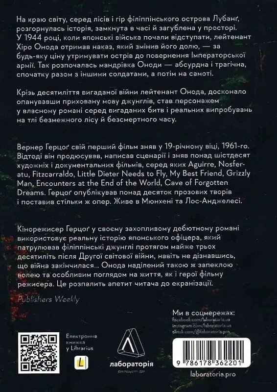 Унікальна історія японського лейтенанта Хіро Оноді, який загубився у часі та просторі маленького філіппінського острова Лубанґ Сучасна казка про Робінзона Крузо, який загубився серед справжніх джунглів та ілюзорної імперської честі На краю світу, серед лісів та гір Філіппін, розгорнулася історія та замк. Кінець 1944 року, військове враження змусило японську армію відступати з острова Лубанґ. Лейтенант Хіро Онода отримав наказ – за будь-яку ціну утримувати острів до повернення Імператорської армії. Є лише одне правило: заборонено гинути від власної руки. У випадку, якщо вас захопити враг – ввести в оману. Так розпочалося подорож Оноді – мандрівка крізь кілька десятиліть вигаданої війни. У книзі «Сутінки світу» Вернер Герцоґ увічнює роки абсурдної боротьби Оноді. Солдата, який серед павутини вигаданих битв, сліпої віри в ілюзорну імперську честь і реальних фізичних випробувань, губив у собі найважливіше — людину.